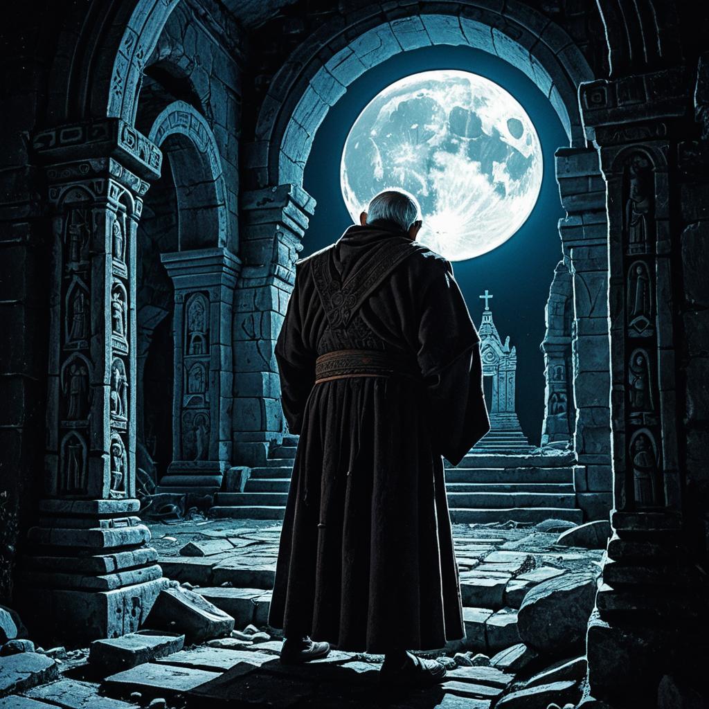 Elderly Monk in Moonlit Ruined Chapel