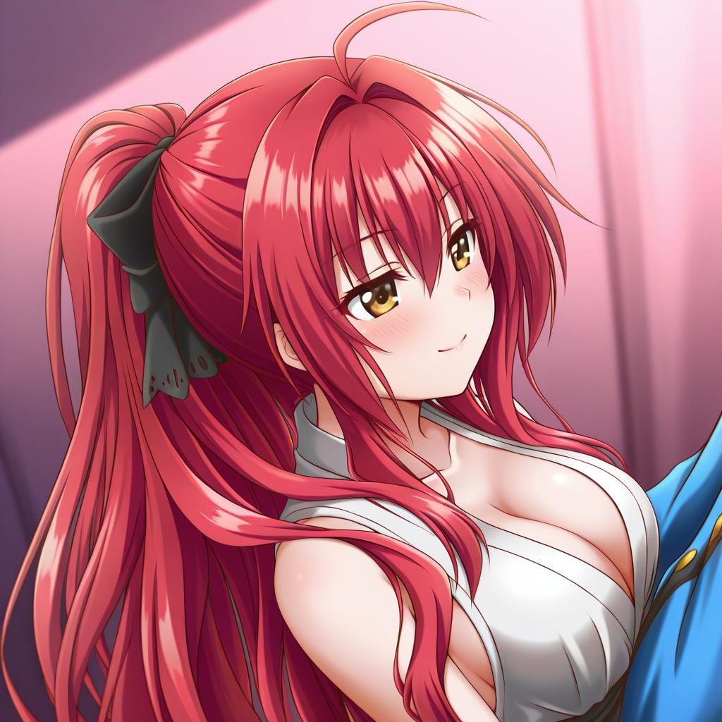 Digital illustration of an anime-style girl with very long red hair tied in a high ponytail with a black bow. She has golden-brown eyes and a soft smile, wearing a white sleeveless top. The character features an ahoge (single hair strand sticking up) and hair intakes framing her face. The background is softly blurred with warm tones.