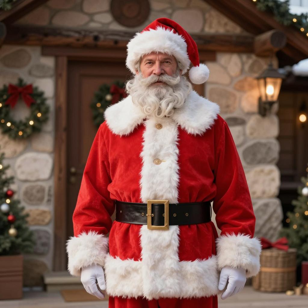 Christmas carol costume, photograph of a middle-aged man in a detailed, red and white Santa Claus costume with fur trim, brown belt, standing in front of a rustic wooden house with stone walls, Christmas decorations, daytime, sunny, mustache, Santa hat, front view, hands by sides, festive atmosphere, realistic style, holiday season