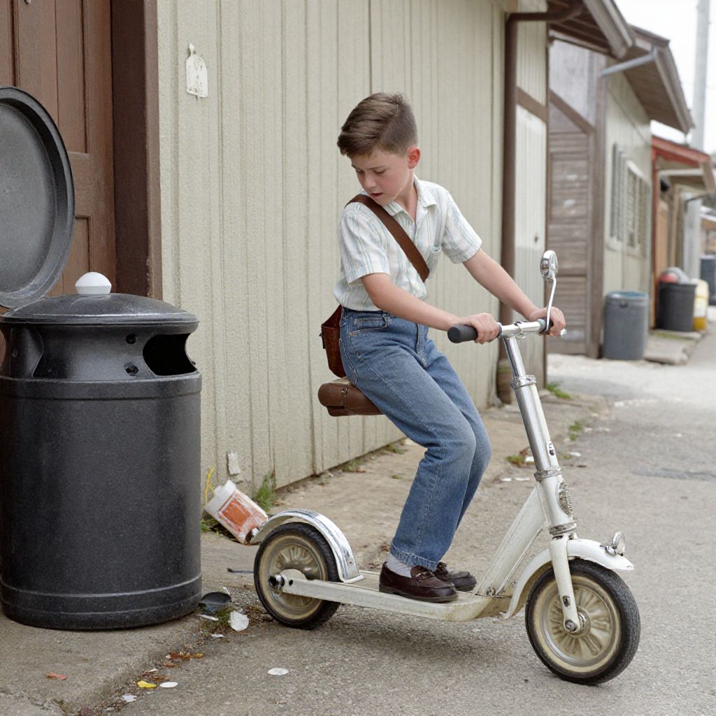 Glyph 15-year-old boy riding a cushman eagle scooter down an alley and crashing into a garbage can. 1950s, high detail, ultra realistic, in color.,