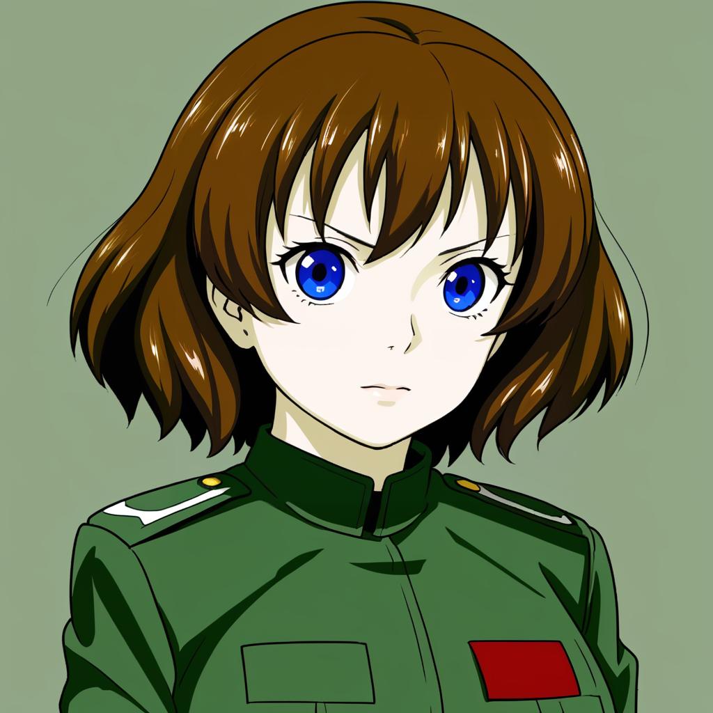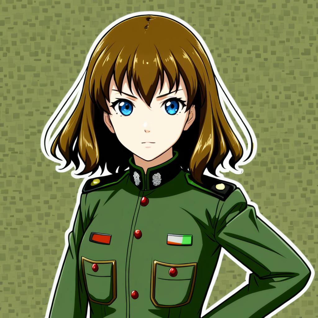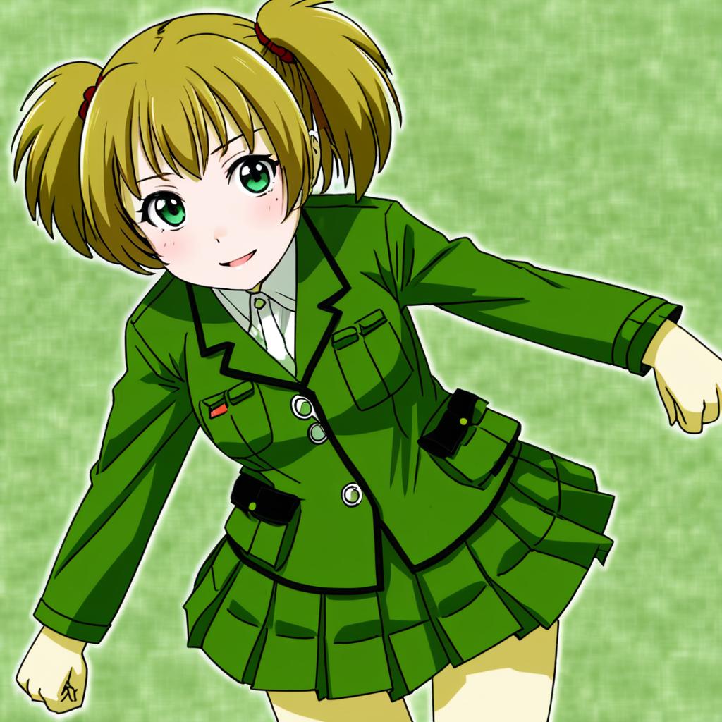 Aki (girls und panzer), girls und panzer, 1girl, green eyes, short hair, light brown hair, short twintails, low twintails, hair tie, pleated skirt, long sleeves, by artist yonedatomo mizu, anime