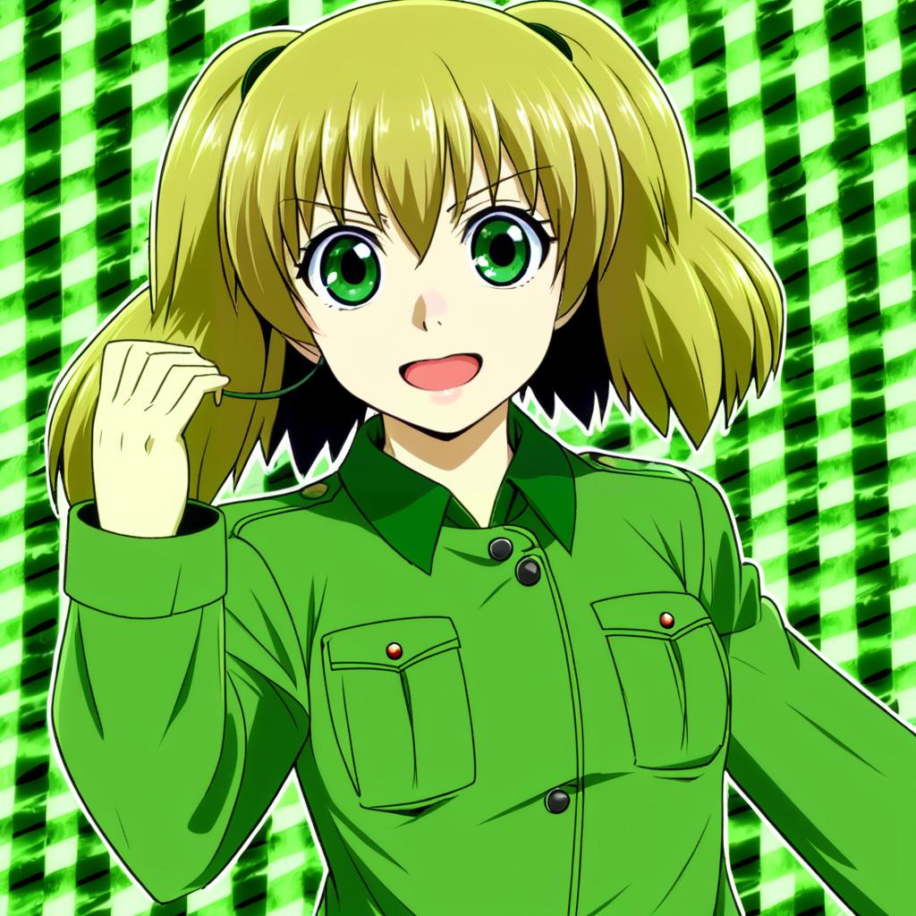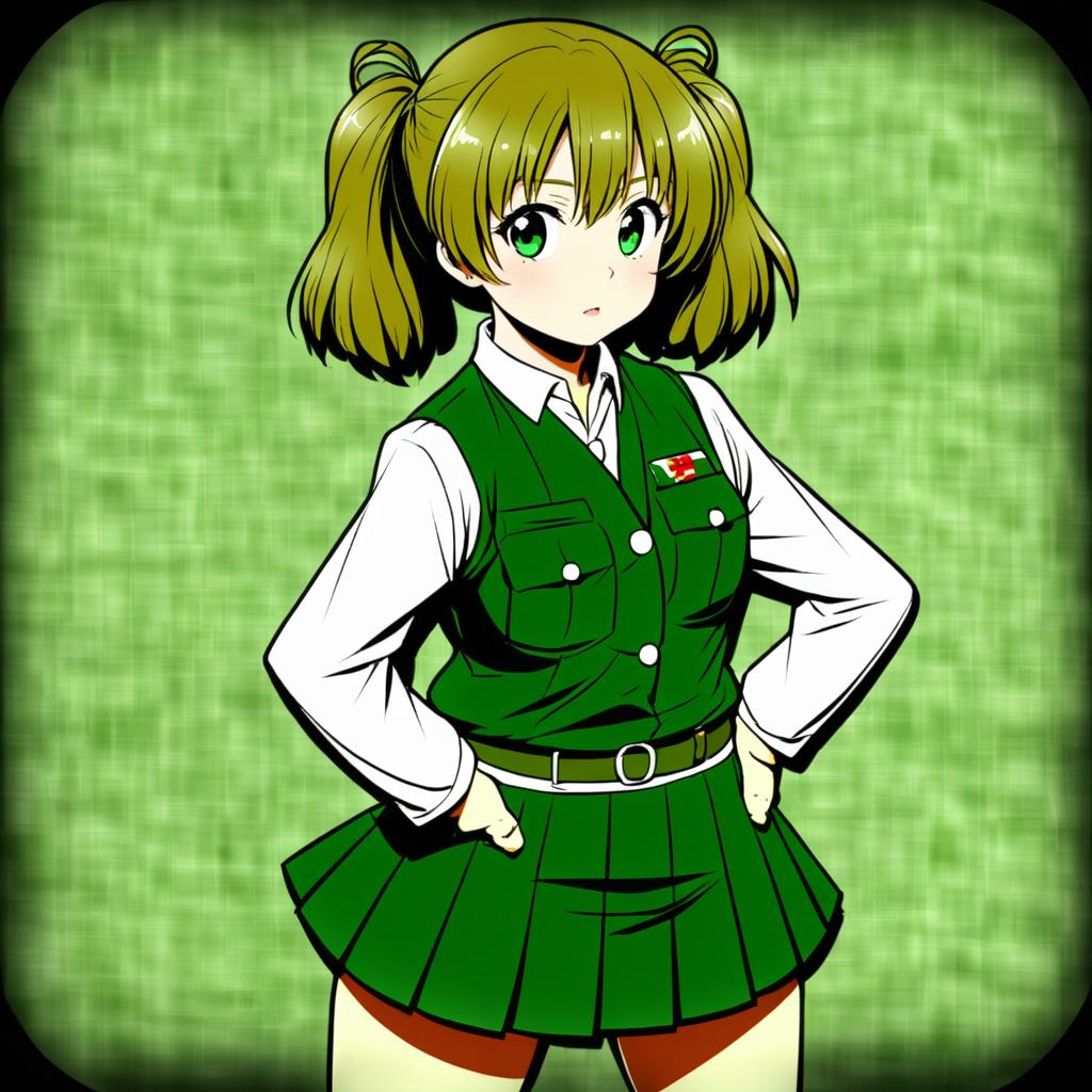 Anime-style illustration of a girl with light brown short twin tails and bright green eyes. She is wearing a green pleated skirt and matching green vest over a long-sleeved white shirt. The character has a confident pose with hands on hips, standing against a textured green background.