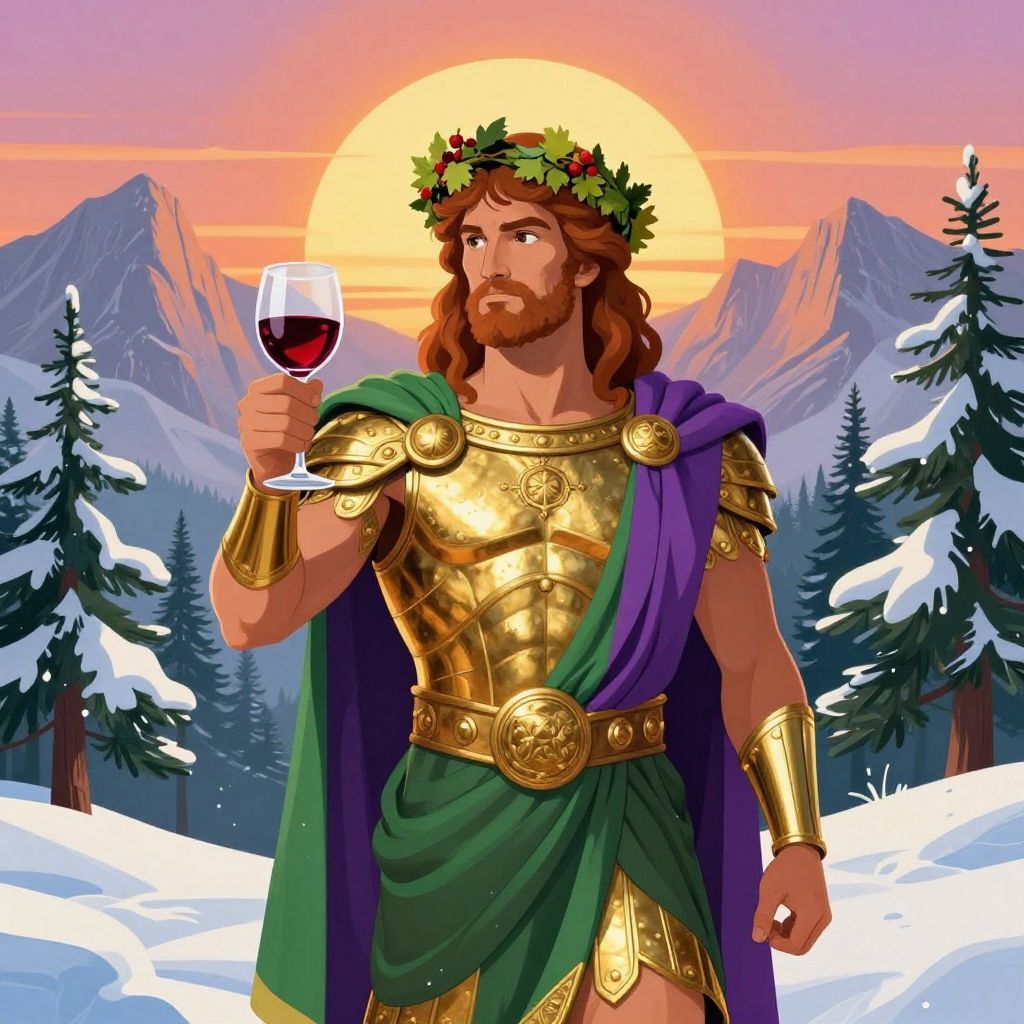 Illustration of Dionysus, the Greek god of wine, pleasure, and revelry, depicted with a grapevine crown and holding a glass of red wine. He wears golden armor with green and purple draped robes, set against a backdrop of snow-covered pine trees and towering mountains illuminated by a vibrant sunrise.