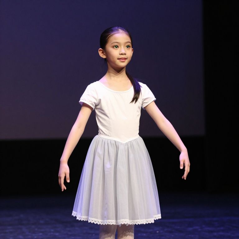 A graceful young girl with long black hair and expressive green eyes, dressed in a modest ballet outfit featuring a simple white blouse, gathered at the waist with lace trim, and a light grey full skirt, standing center stage in a community theater during a school performance with soft spotlight lighting