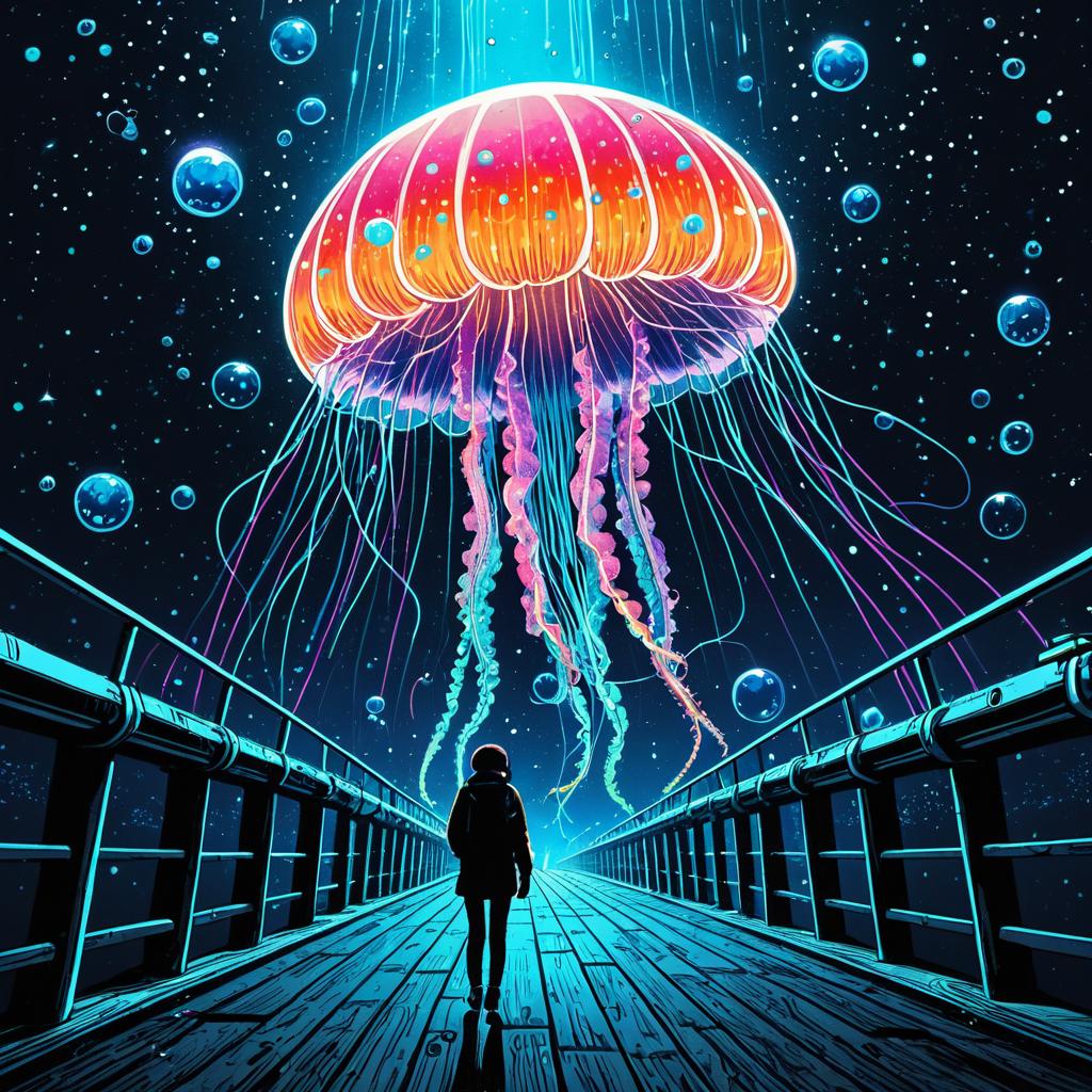 Vibrant colorful comic line art of a glowing jellyfish drone viewed from behind. Set at a space pier in underwater Tokyo 2800, featuring bioluminescent trails and digital bubbles. Styled by Herg with a playful and dynamic composition.
