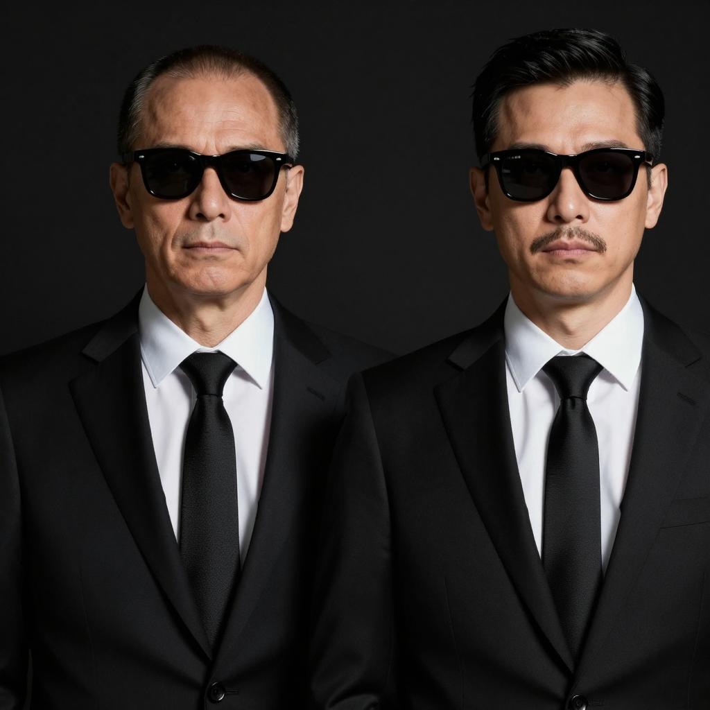 Photograph of two men in black suits, white shirts, and black ties, wearing black sunglasses. Both have shadowed faces, one with receding hair and the other with a mustache. Black background, high contrast lighting. Side-by-side, identical poses.