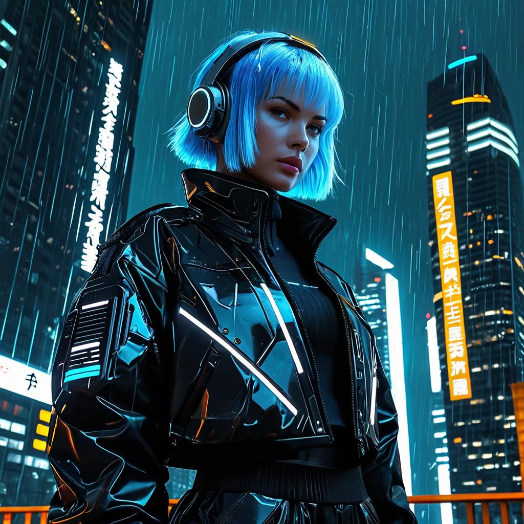 1girl, lady with cybernetic parts, glowing visor, short light blue hair, techwear, oversized black jacket, skyscraper outdoors, neon rim light, night, rain