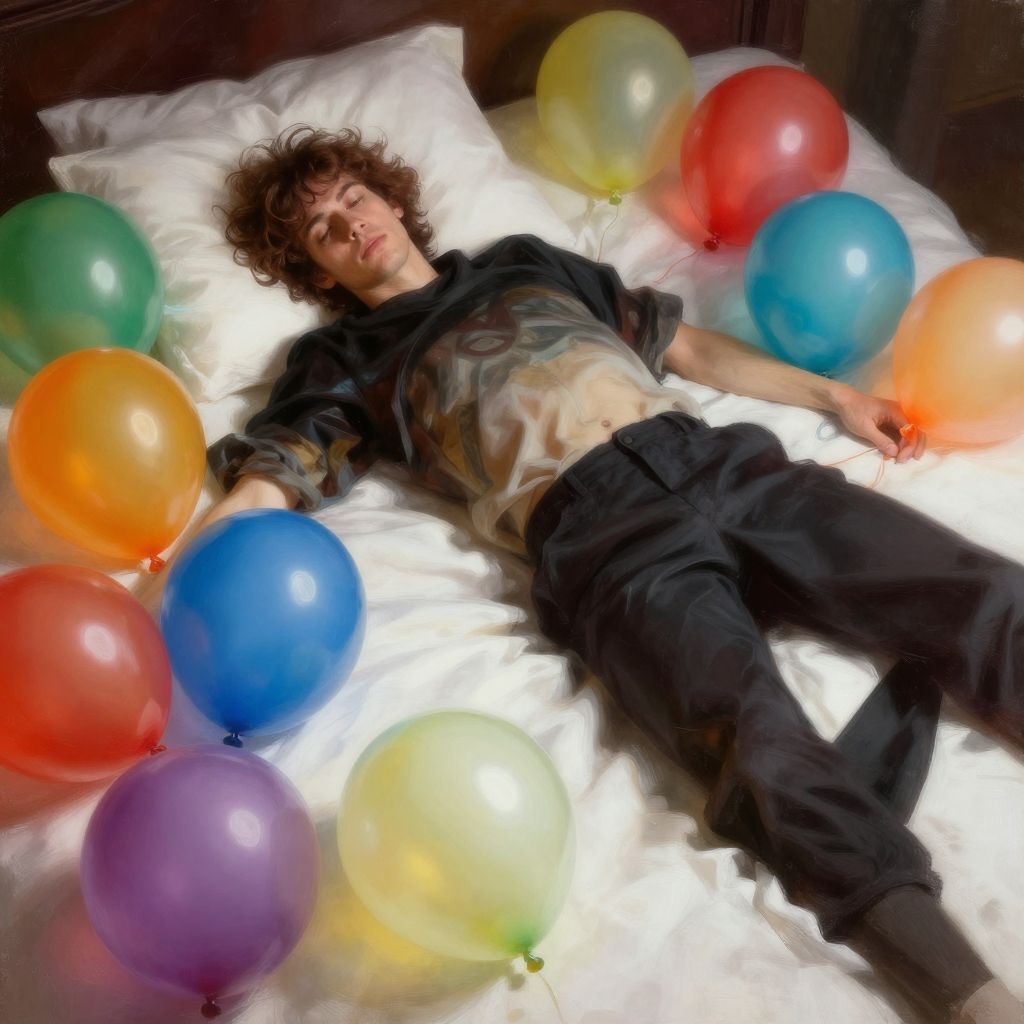 Photograph of a young man with curly brown hair, lying on a white bed with white pillows. He is wearing a black and gray camouflage t-shirt and black pants, with his eyes closed and a relaxed expression. Surrounding him are colorful balloons in red, orange, yellow, green, blue, purple, and clear, scattered across the bed. The background includes a dark wooden headboard. The lighting is bright, highlighting the vibrant colors of the balloons and the white bed linens. The overall mood is playful and whimsical.