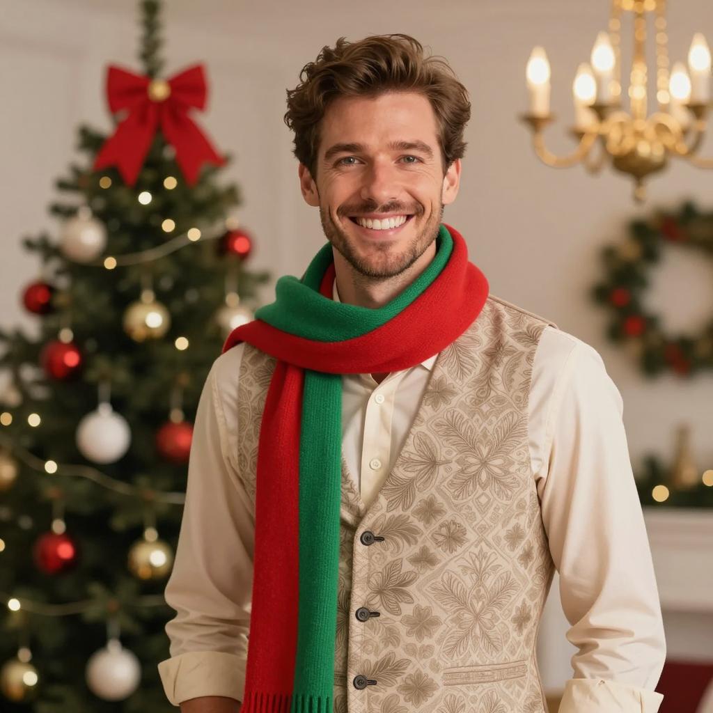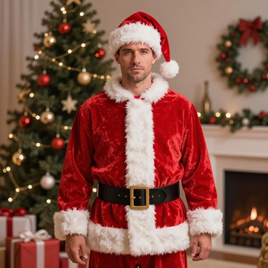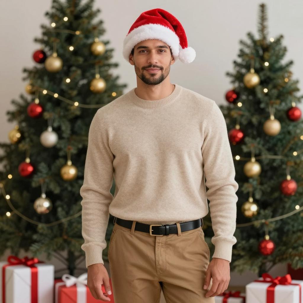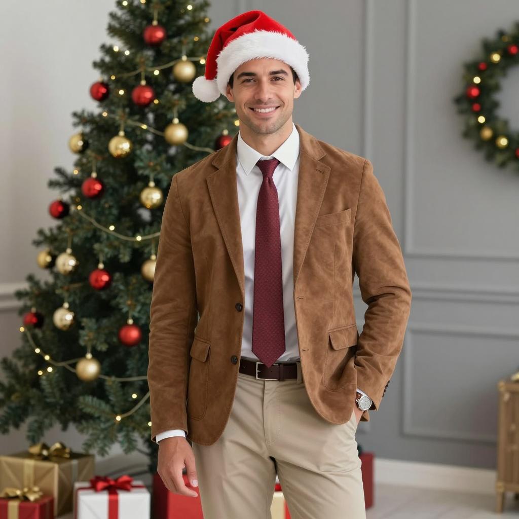 Confident young man wearing a brown suede blazer, white dress shirt, red patterned tie, beige pants, brown belt, and a red Santa hat standing indoors next to a decorated Christmas tree with red and gold ornaments and wrapped gifts. The festive setting includes a gray wall adorned with a Christmas wreath and warm golden lights, creating a holiday atmosphere.