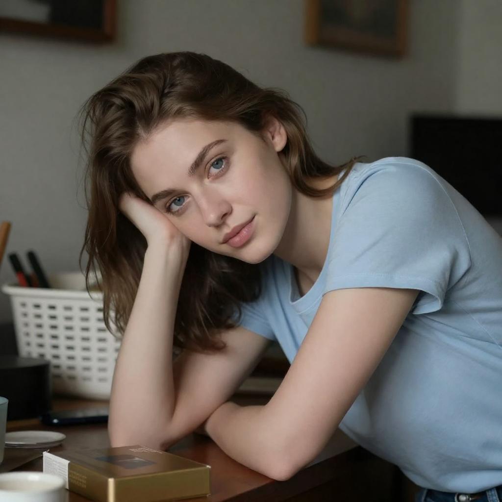 Photograph of a young woman with light brown hair lying in bed, head resting on a white pillow. She has light blue eyes, slightly parted pink lips, and a neutral facial expression. She wears a pink, ruffled nightgown. Background is blurred, showing wooden furniture and a dark hallway.
