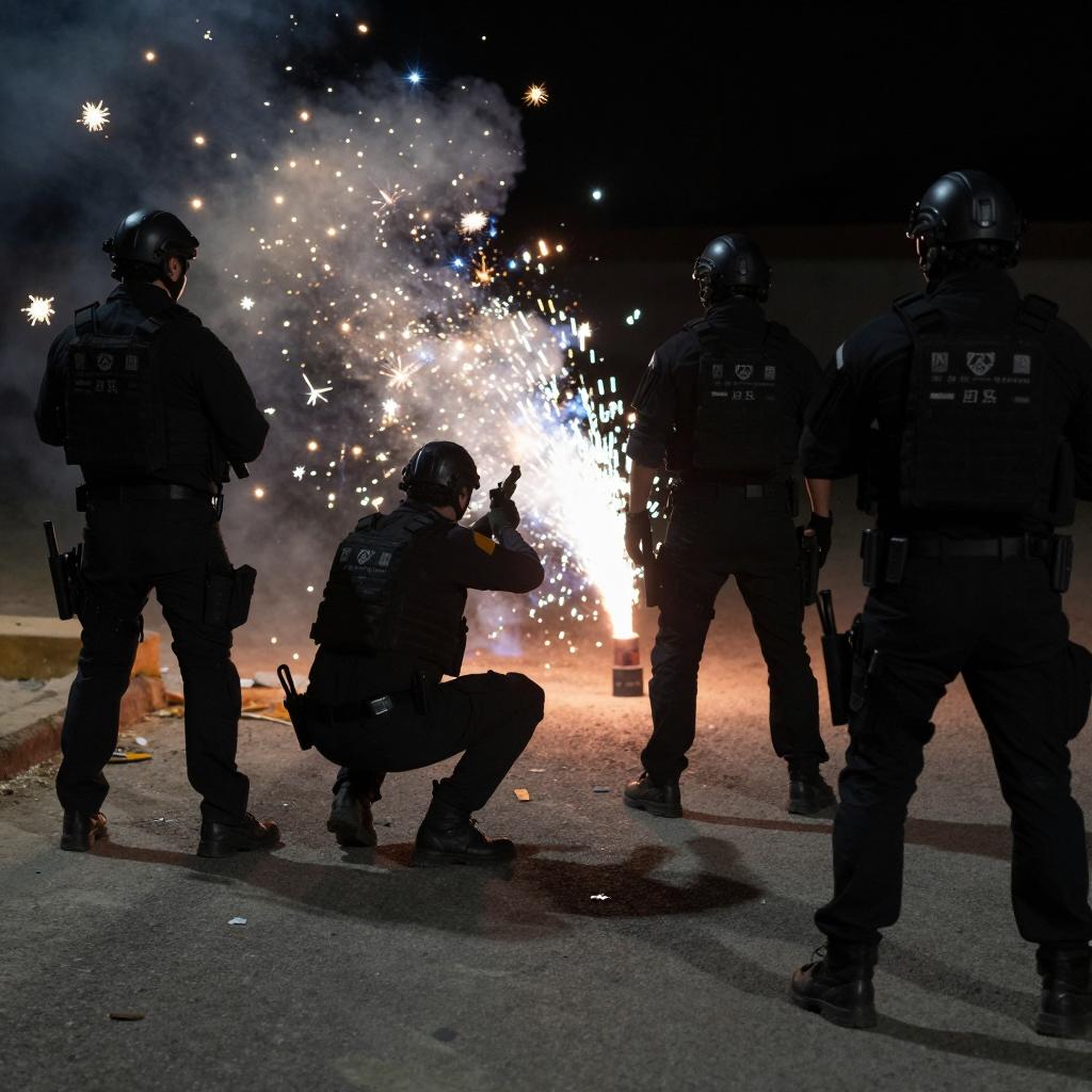 Nighttime photograph of a dark street. Four men in tactical gear with visible firearms. Bright orange and blue electrical sparks in the background. One man crouches with gun raised, others stand with backs to camera. Rough concrete ground, scattered debris. Light from sparks highlights scene. Spilled shadows and sparks create dynamic motion.