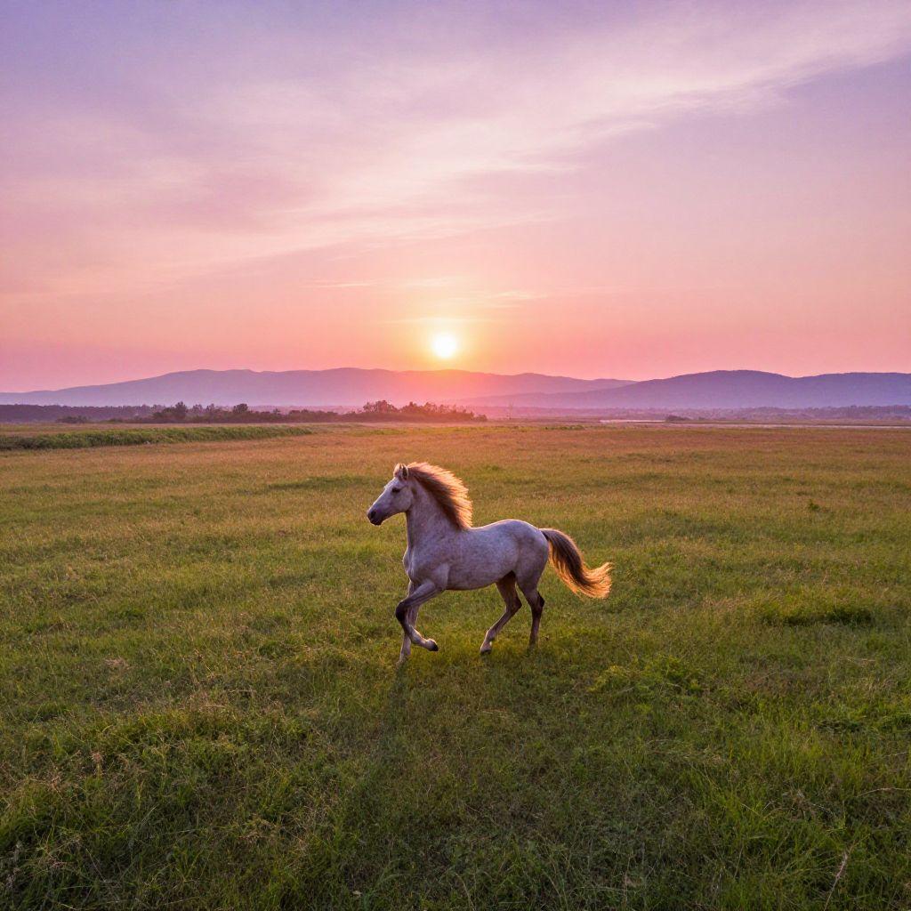 Imagine a tranquil digital landscape reminiscent of Monet's serene watercolor paintings, capturing a lush meadow bathed in the warm glow of a vibrant sunset sky. From an aerial perspective, observe how a solitary, majestic creature gracefully traverses the verdant field, its shimmering mane catching the golden light as it elegantly gallops. The background features soft, blended hues of pink and purple, with distant mountains faintly visible through the warm, hazy atmosphere. This dreamlike scene evokes feelings of peace, wonder, and enchantment, inviting viewers to lose themselves in the ethereal beauty of this captivating landscape.