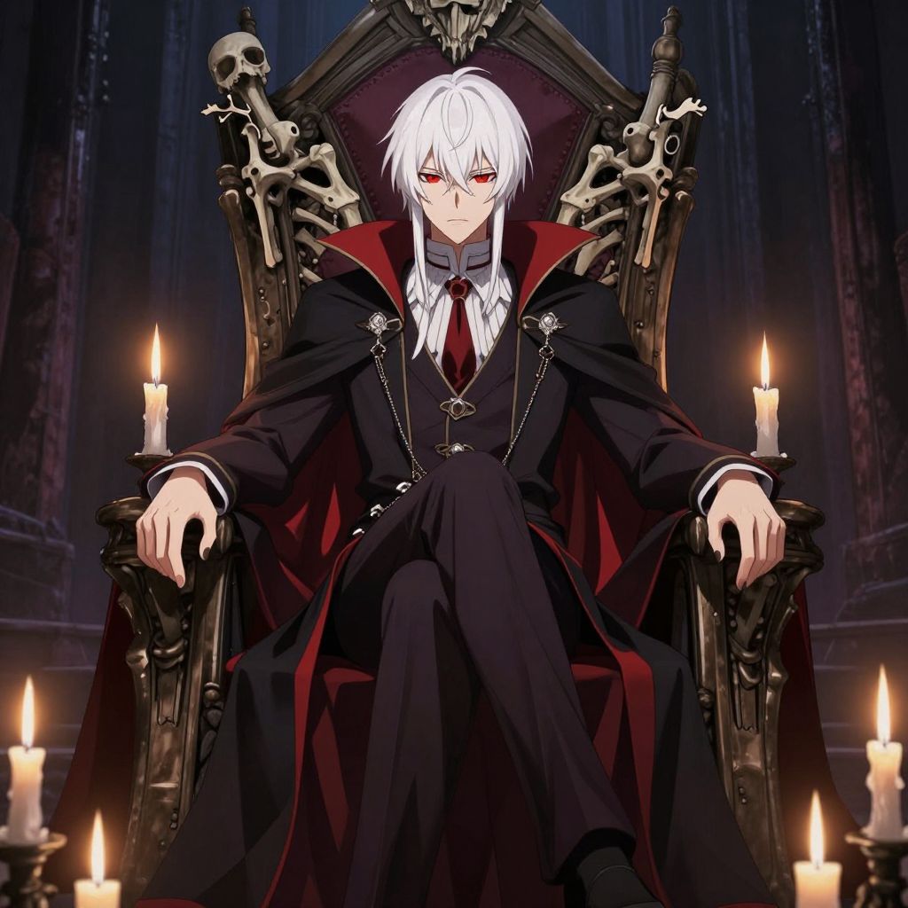 A digital anime-style drawing depicts a pale-skinned male character with white hair and red eyes, sitting on a dark throne adorned with skulls. He wears a black, gothic-style suit with a red cape and white shirt, accented by a black tie. His expression is stern and intense. Surrounding the throne are several lit candles, casting a warm glow against the dark, gothic cathedral-like background. The character's hands rest on the armrests of the throne, enhancing his commanding presence. The overall atmosphere is dark and ominous, emphasizing a sense of power and authority.