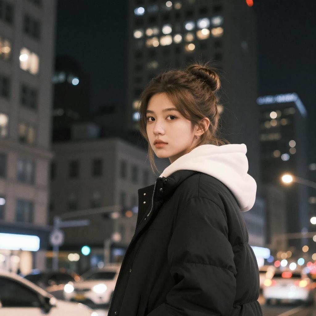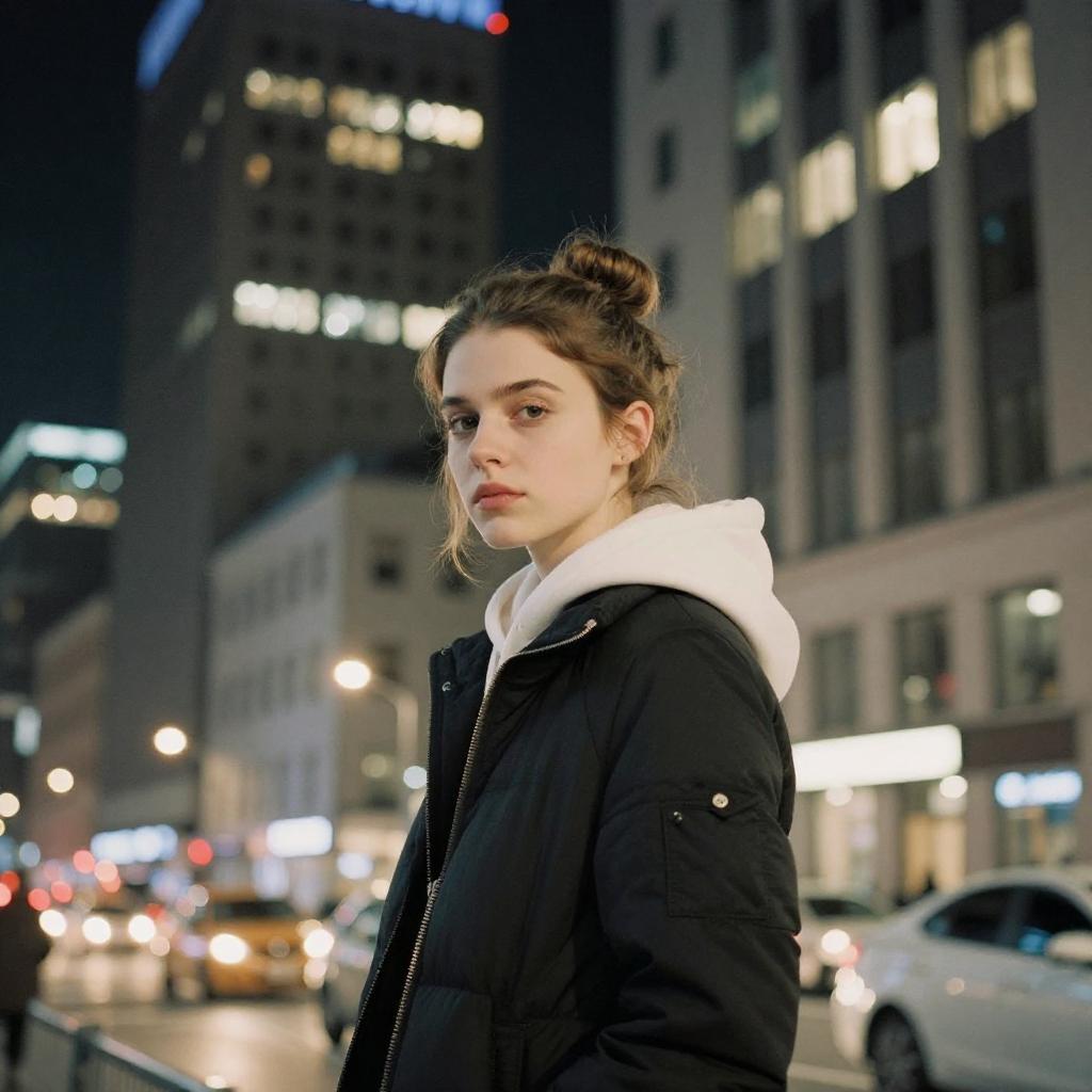 Photograph of a young woman with fair skin and light brown hair in a bun, wearing a black winter coat with a white hood, standing in an urban cityscape at night. She looks over her shoulder with a subtle, serious expression. The background features tall, illuminated buildings with yellow and white lights, and blurred city cars below. The image has a slightly grainy, high-contrast effect.