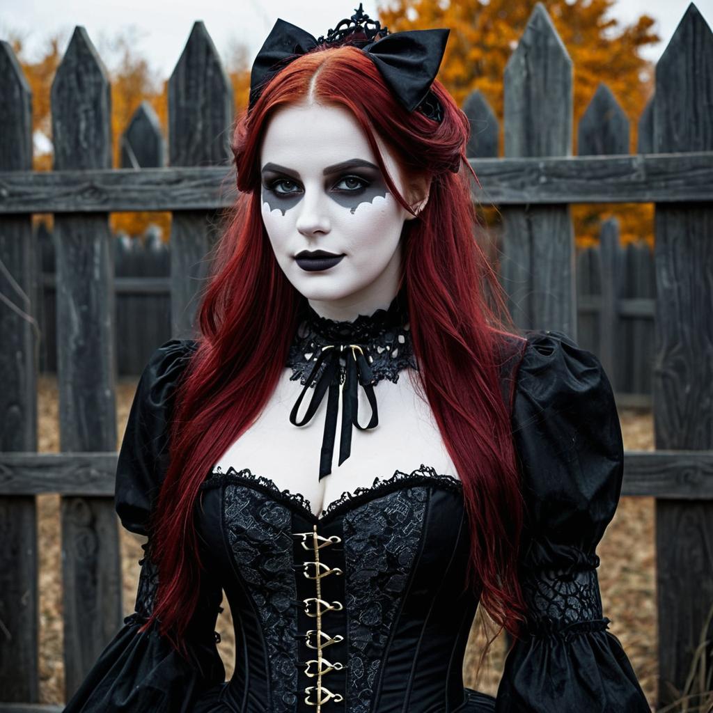 Epic halloween costume woman, digital portrait of a woman, Gothic style, long red hair, pale white face with black makeup, dark lipstick, black eye design, wearing a grey long-sleeve dress with black lace details, white puffed sleeves, black choker with bow, black corset belt with gold buckle, wooden fence background, daytime, eerie atmosphere, realistic ures, detailed makeup, cosplay, T2I, SD, spooky, gothic aesthetic