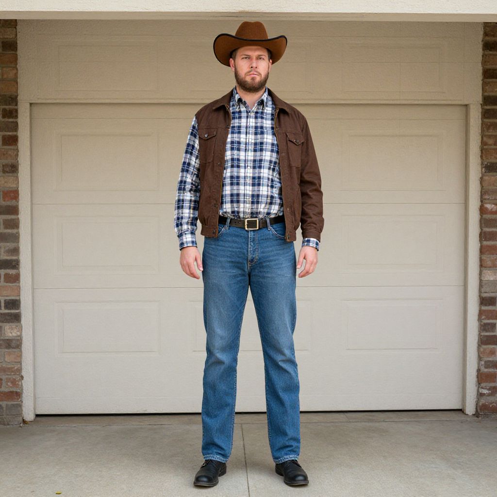 Funny tall man costume, 1boy, male focus, solo, plaid shirt, hat, pants, jacket, shirt, denim, facial hair, full body, jeans, brown jacket, black footwear, brown headwear, outdoors, standing, beard, open clothes, collared shirt, long sleeves, open jacket, checkered shirt, shoes, building, closed mouth, cowboy hat, plaid