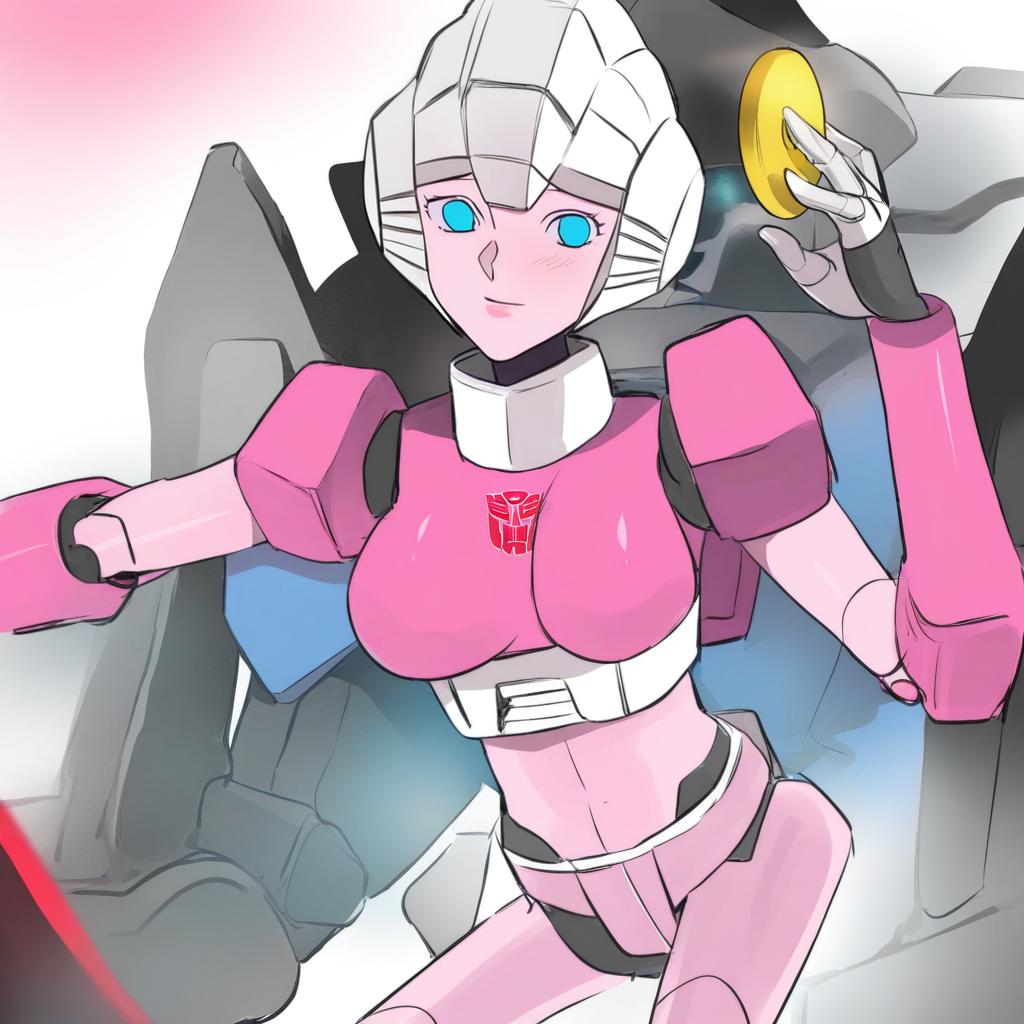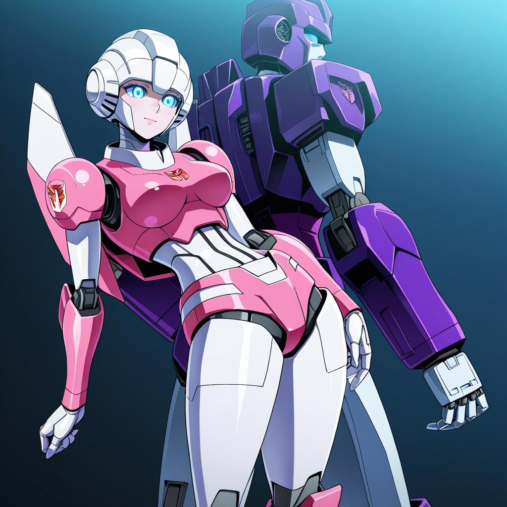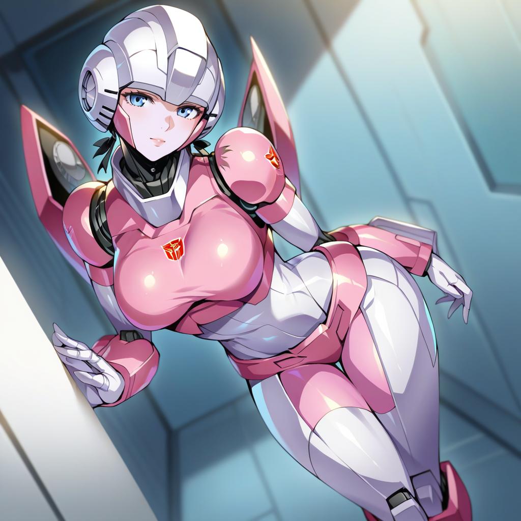Arcee, transformers, 1girl, blue eyes, medium breasts, autobot, robot girl, mecha, by artist nase, animagine