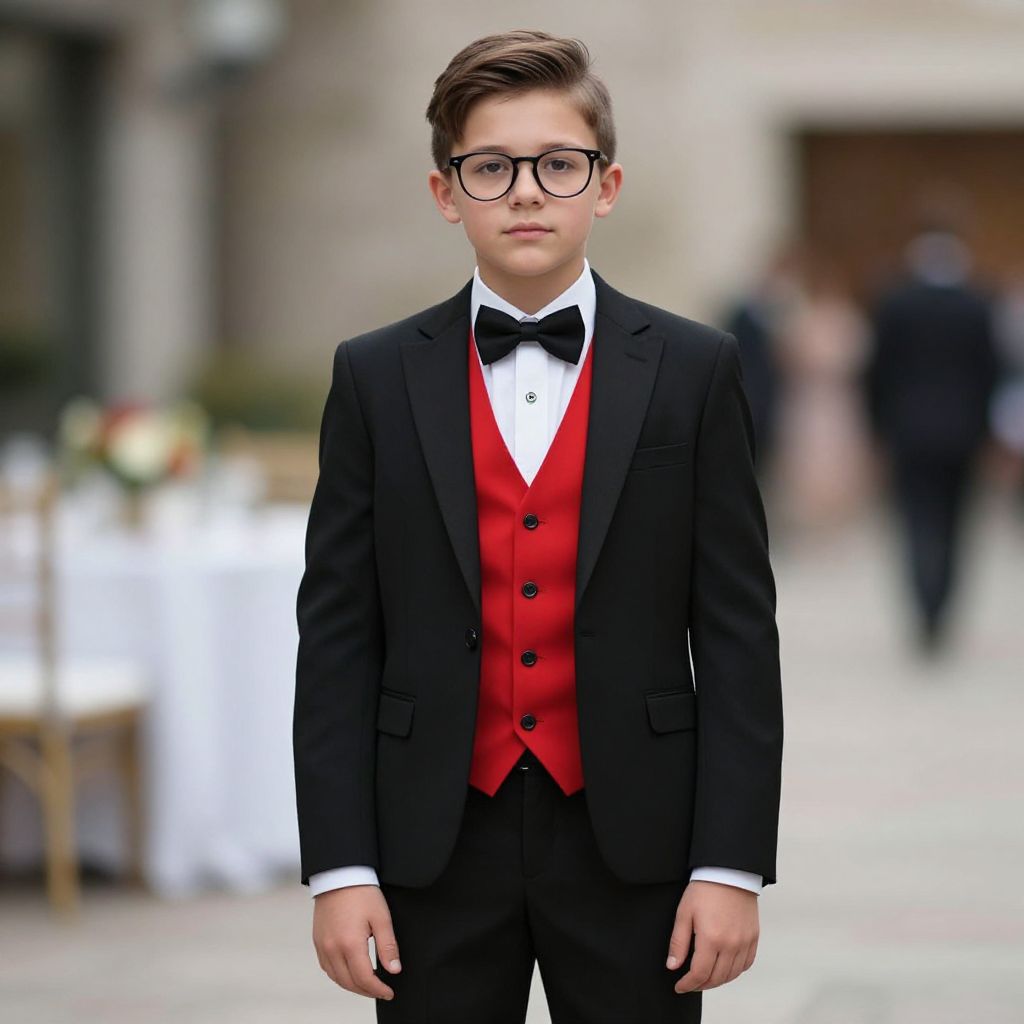 Photograph of a young boy standing outdoors, wearing a formal black tuxedo with a bright red vest, black bow tie, and white dress shirt. He has short brown hair, fair skin, and wears black-rimmed glasses. The background is slightly blurred, featuring an outdoor setting with white-clothed tables, potted plants, and indistinct people in the distance. The boy's expression is neutral, and the lighting is natural, highlighting his attire. The overall style is formal and elegant, suggesting a special event or occasion.