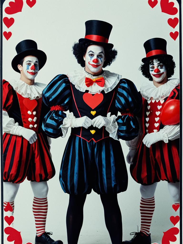 Three male clowns dressed in Queen of Hearts inspired costumes featuring heart prints, puffy sleeves, and top hats. Each clown has white face makeup with red noses and distinct clown makeup. The costumes predominantly use red, blue, black, and white colors, with striped stockings and heart motifs. They stand against a plain background framed with red heart designs.