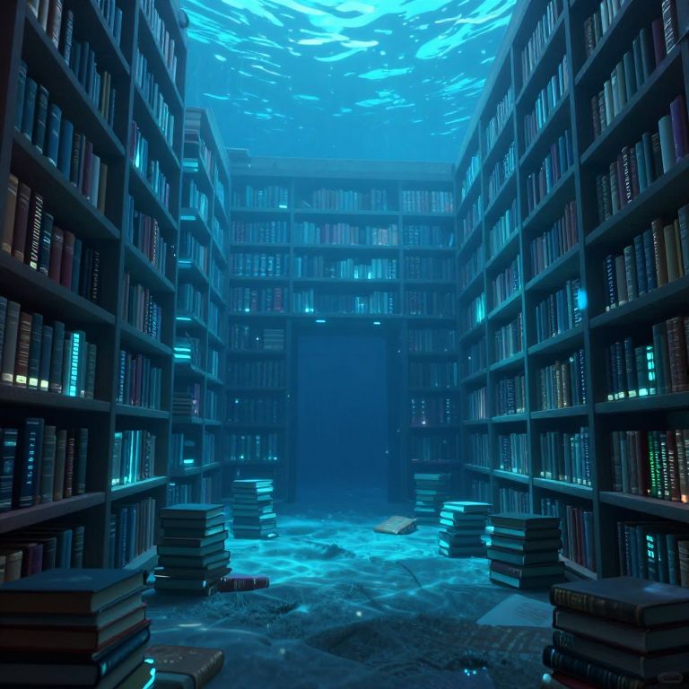 An ethereal underwater library rendered in a surreal, cyberpunk-inspired 3D render, featuring towering shelves lined with bioluminescent books, stacks scattered across the sandy floor, and a hauntingly serene ambiance illuminated by faint, otherworldly light filtering through the deep blue waters.