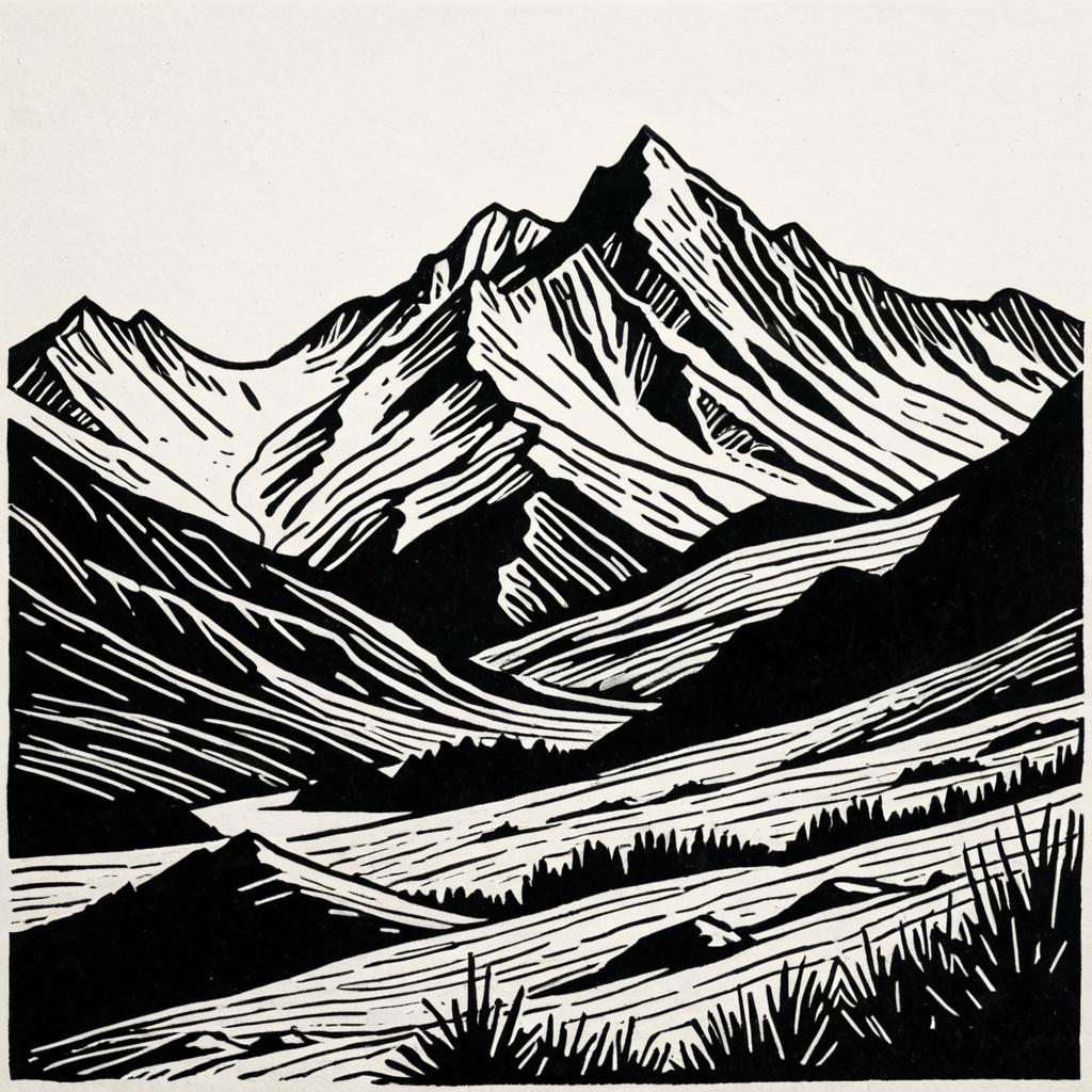 Mountain range linocut minimalist sketch, grayscale, high contrast aesthetic, American topographical with naturalistic detail, serene and calm, minimalistic yet expressive.