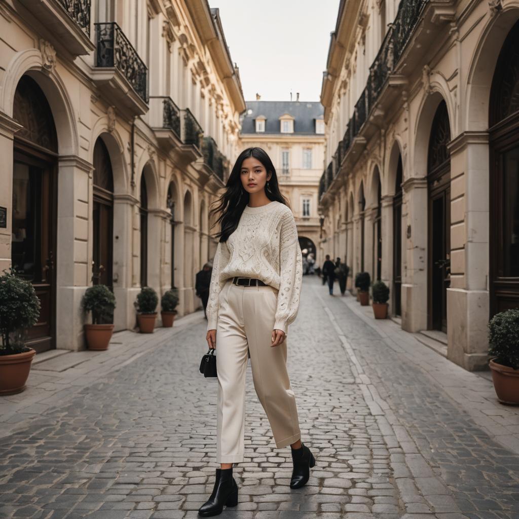 Full body shot of a stylish Asian woman with long glossy black hair walking on a cobblestone street in a European city. She wears a cream knit sweater and matching pants, paired with black ankle boots and carrying a small black handbag. The street is flanked by elegant baroque buildings with ornate balconies and detailed facades. The soft diffused natural light enhances the cinematic and photorealistic quality of the image.