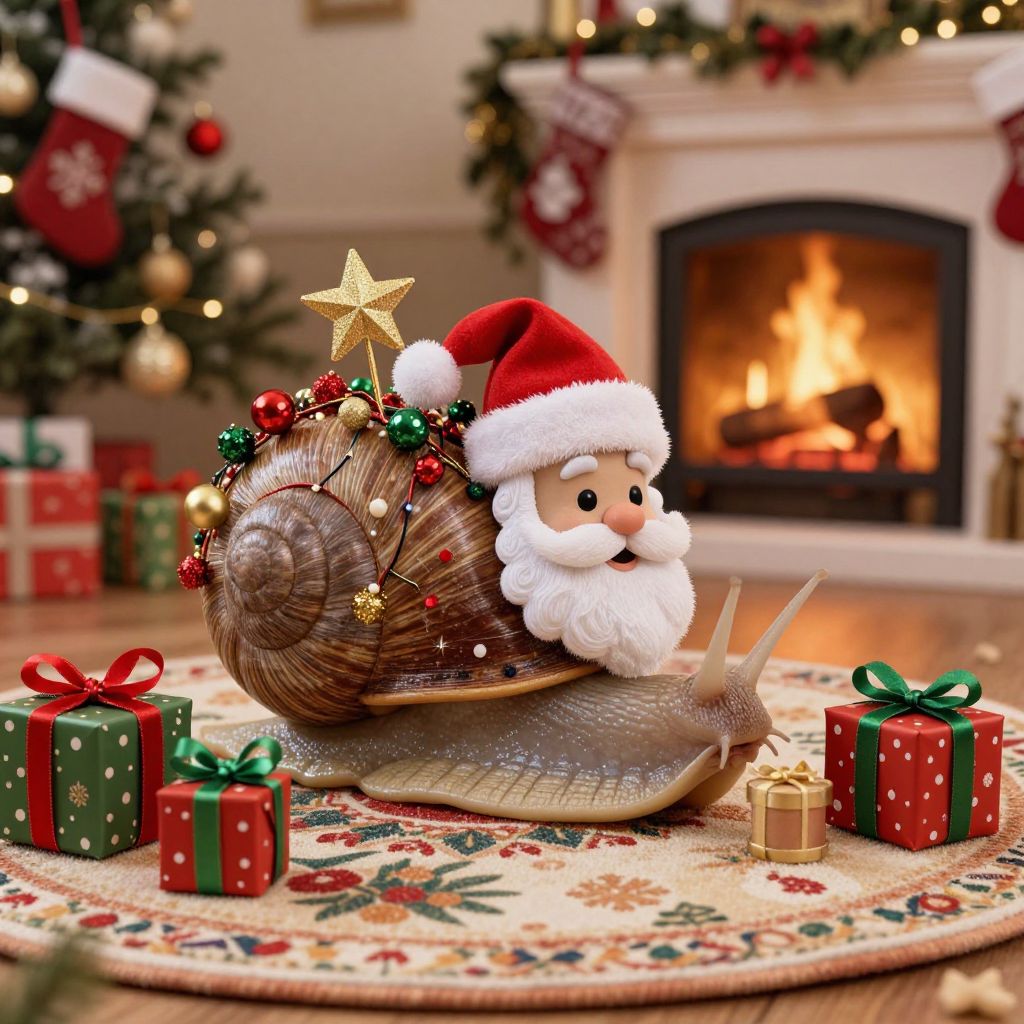 \"Create a charming, hyper-realistic image of a snail cosplaying as Santa Claus, with a Christmas-themed shell decorated with garland, ornaments, and a Christmas star on top, The snail should be wearing a Santa beard on its face and a Santa hat on its head, adding to the festive spirit, The snail should be surrounded by little Christmas presents, each wrapped in vibrant, festive paper and adorned with curly ribbons, The scene should be set on a Christmas-themed rug, with intricate holiday patterns and a cozy, warm texture, In the background, a cozy fireplace should be visible, with a warm, glowing fire and a mantle decorated with stockings and holiday decorations, The overall effect should be one of heartwarming, festive joy, as if the viewer is witnessing a magical, Christmas wonderland that is both adorable and enchanting