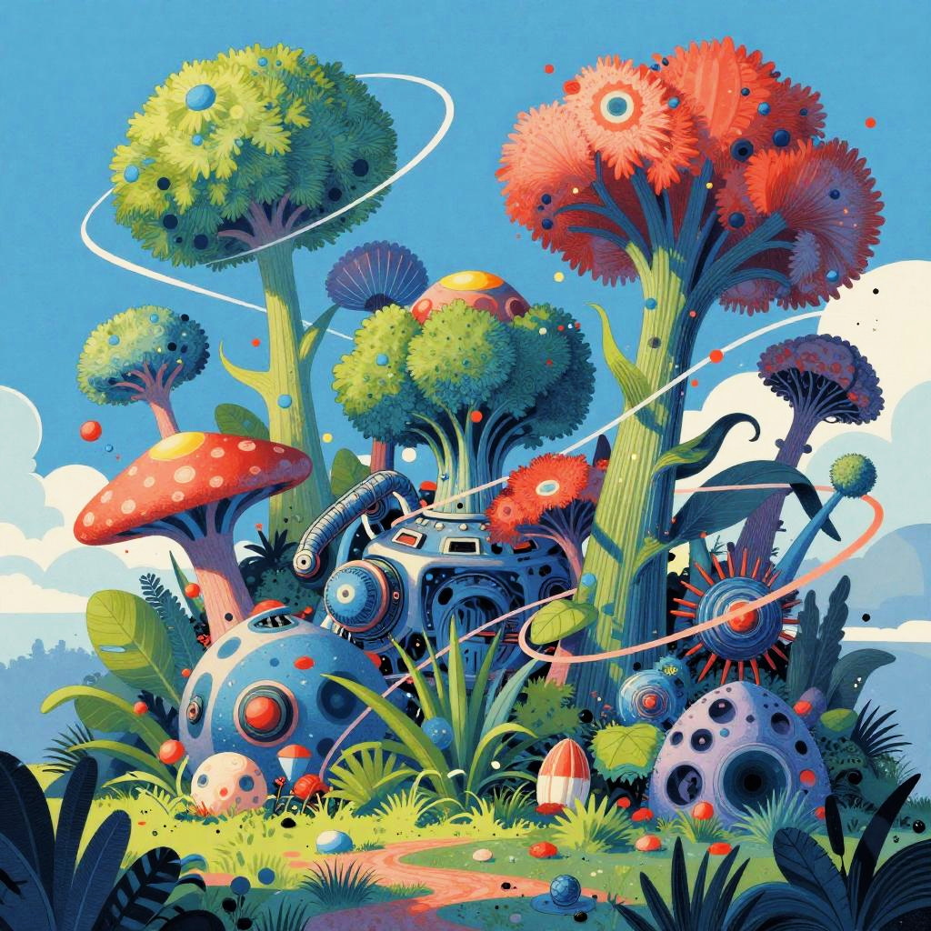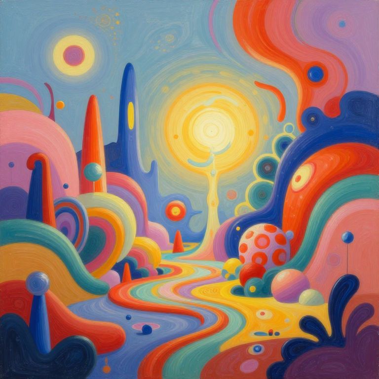 Art:7zvuijgx_w8= inspired surreal landscape with vibrant colors and abstract shapes, blending futuristic elements with organic forms, high contrast lighting, intricate textures, digital painting style.