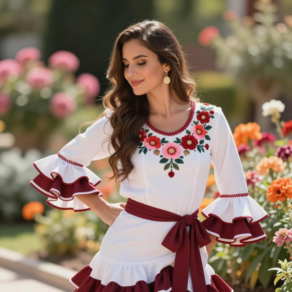 Flamenco dance outfit, photograph of a beautiful young woman with long brown hair, standing in a colorful garden, wearing a white dress with red and pink floral embroidery, maroon sash, smiling slightly, sunlight, bright colors, pink and orange flowers in the background, daytime, bokeh effect, realistic style, natural light, detailed ures, feminine, outdoors, summer, elegant, vibrant.
