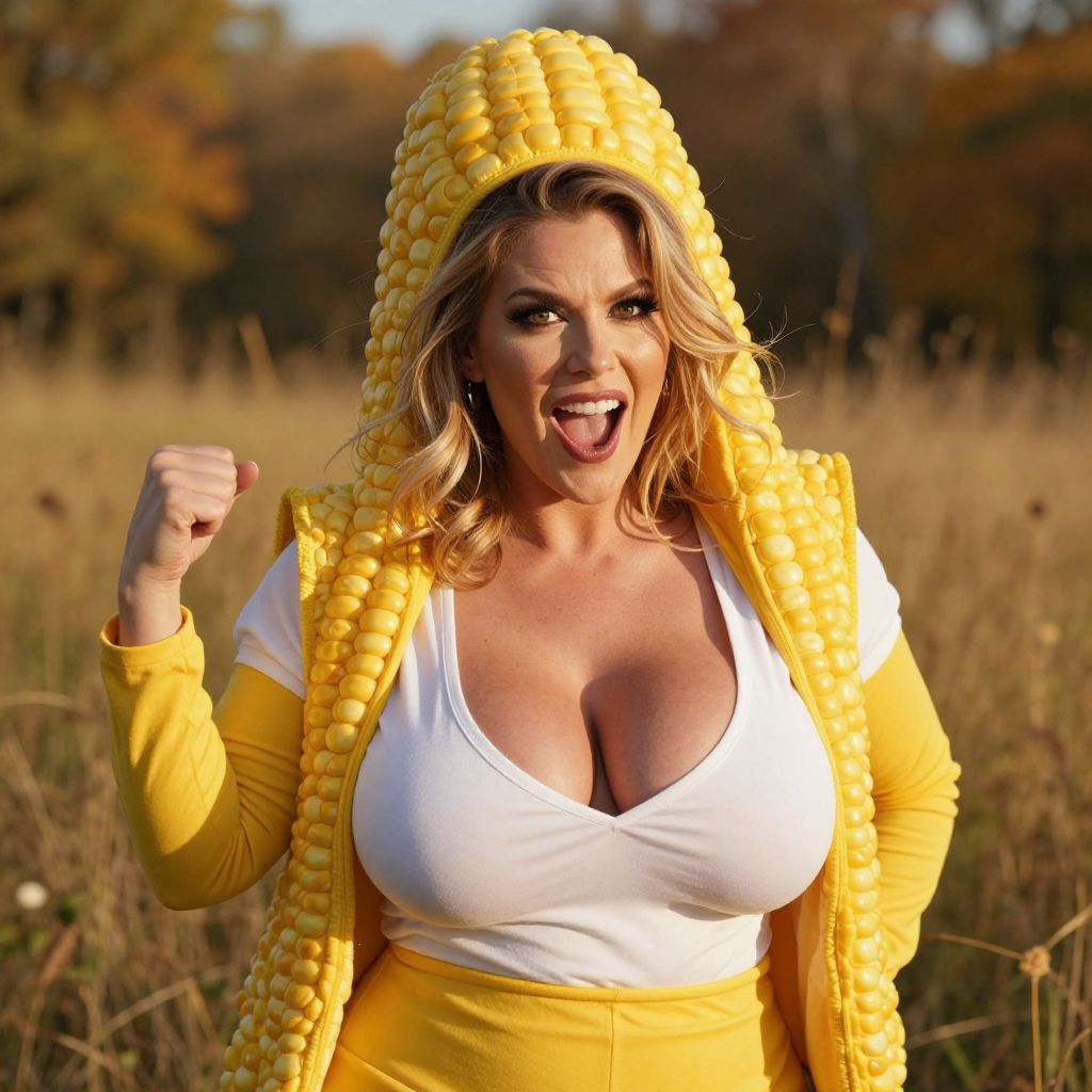 A sexy woman in a yellow corn costume with a white shirt, big tits, and a playful, lively expression, standing in a sunny field during autumn, golden light casting soft shadows, detailed facial features, realistic skin texture, vibrant colors, and a slightly exaggerated, festive vibe — hyper-realistic, 8K resolution, cinematic lighting, dynamic pose, natural movement, high detail, dramatic atmosphere.