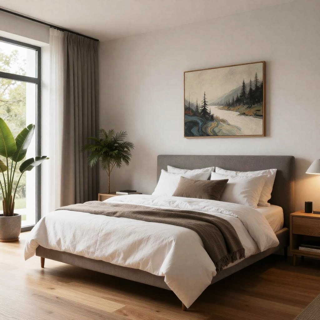 ((masterpiece))), best quality, ultra-detailed, 8k, wallpaper, extremely delicate and beautiful, highresolution, ray tracing, best shadow, (realistic, photorealistic:1.37), professional lighting, photon mapping, radiosity, physically-based rendering, Nayuta Nordic Modern Interior Design, no humans, scenery, bed, indoors, plant, lamp, wooden floor, bedroom, curtains, painting (object), pillow