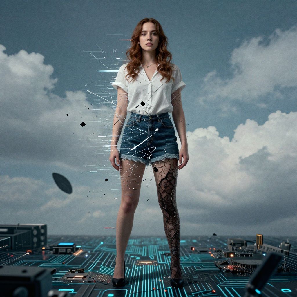 TawnyNewsome, (masterpiece, best quality), full body shot of a ((woman glitching, digital effect, split personality, shattering skin)), (computer glitch effect:1.6), portrait photo, (cinematic, film grain:1.1), schizophrenia, silicon, fragments, clouds, sky, circuit board
