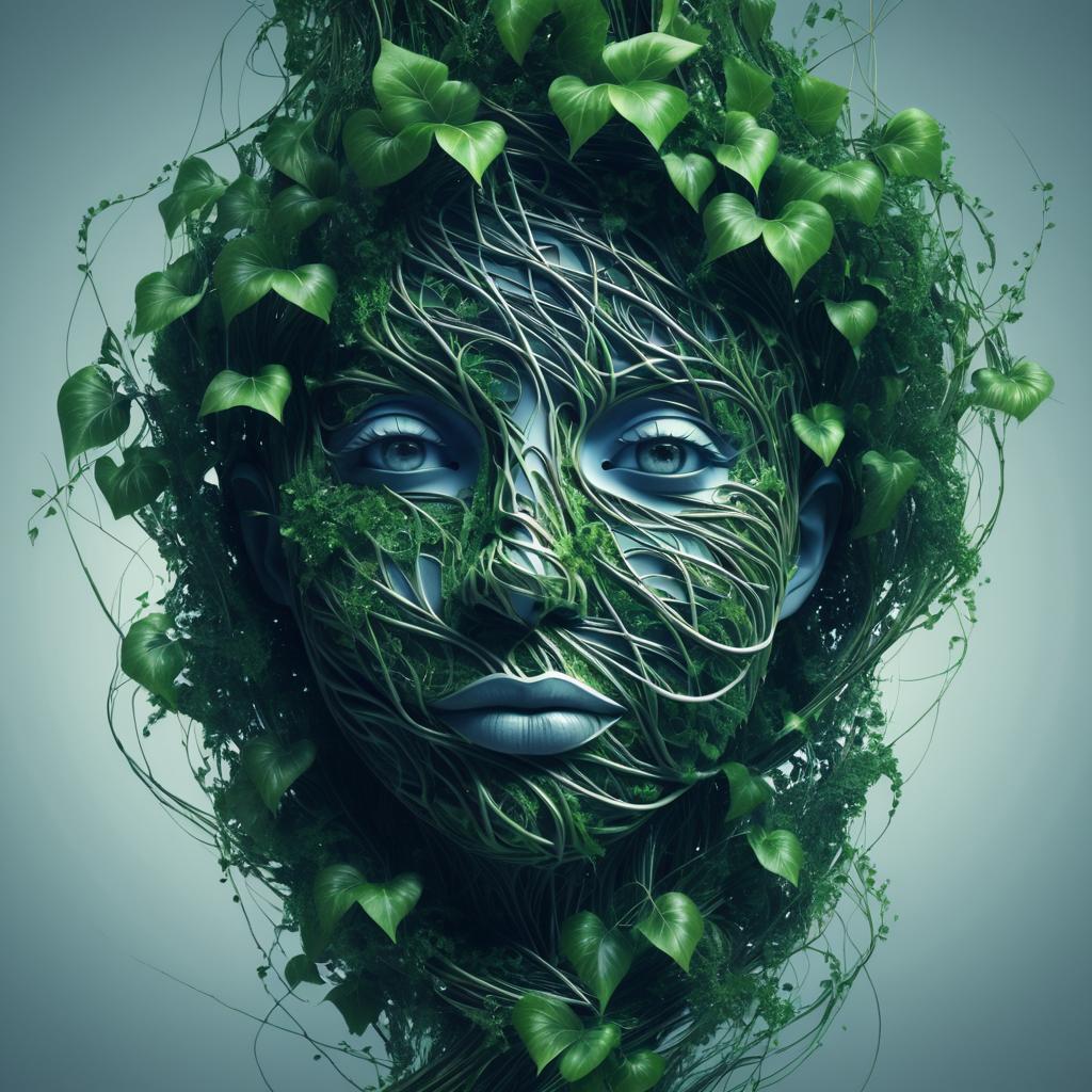 A face made of twisted vines, surreal digital composition with detailed particles.