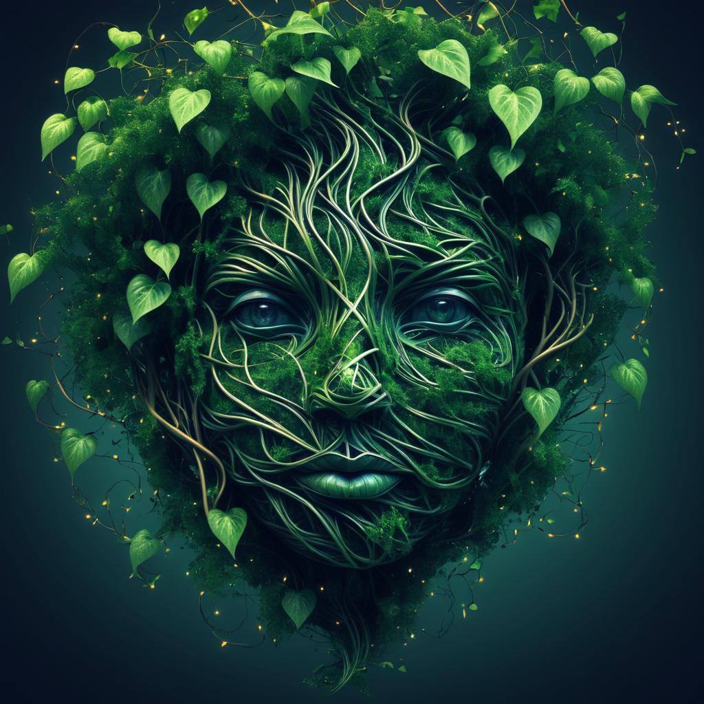 A surreal digital composition depicting a human face intricately formed from twisted green vines and lush foliage, with heart-shaped leaves and delicate glowing particles surrounding the face. The detailed texture of the vines and moss creates a captivating natural yet mystical appearance against a dark gradient background.