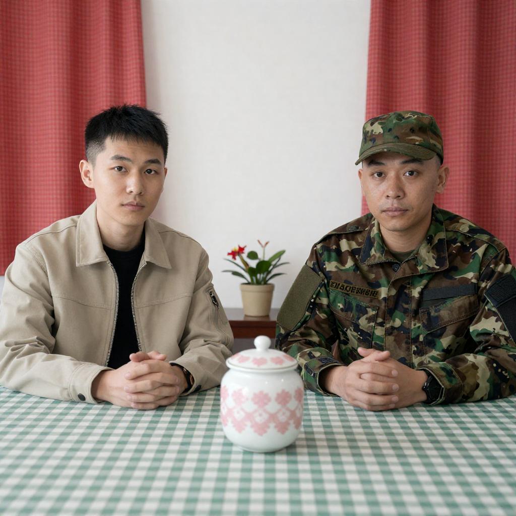 Two people sitting at a green checkered table. One wears a beige jacket, short black hair, neutral expression. The other wears camouflage uniform, green cap, focused expression. Table has pink-patterned jar, small flower pot. Background: white wall, red checkered curtains.
