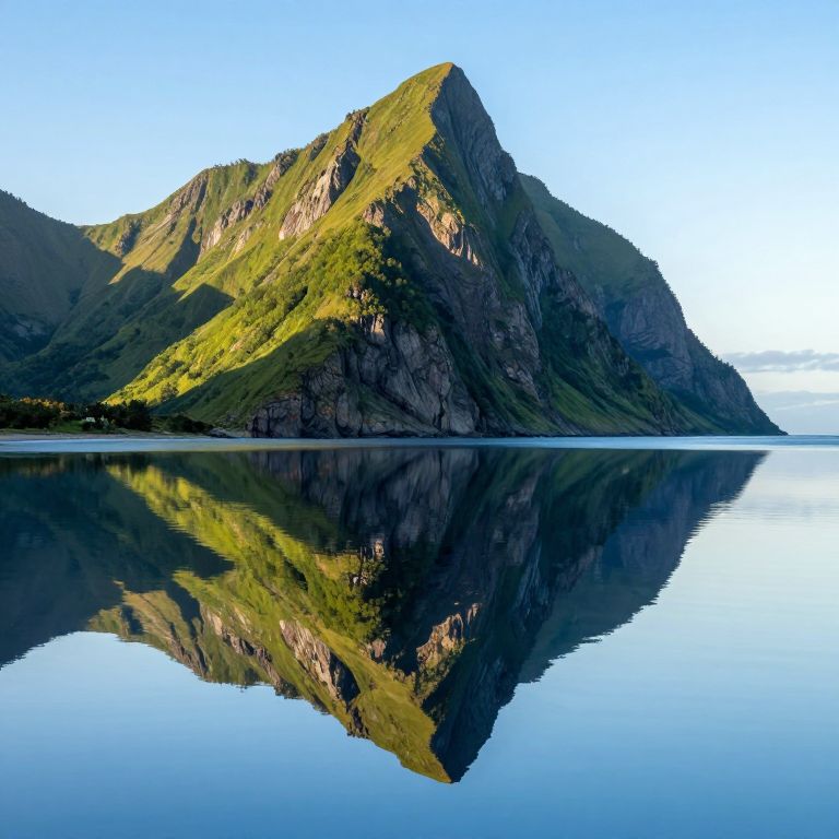 Photograph of a serene mountain landscape. A rugged, green-covered mountain with steep, rocky cliffs is bathed in sunlight, casting a perfect reflection in a calm, mirror-like lake below. The sky is clear and blue, with a few scattered clouds. The mountain's reflection is nearly identical to the actual terrain, creating a symmetrical visual effect. The sunlight highlights the mountain's texture and greenery, while the lake's stillness enhances the reflection's clarity. The overall scene exudes tranquility and natural beauty.