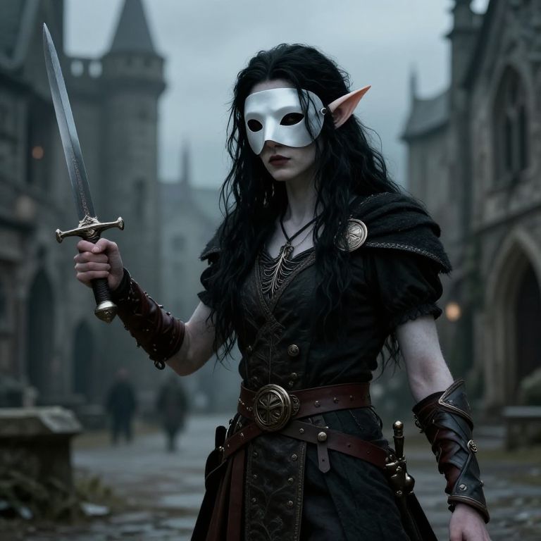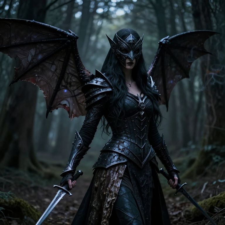 A stealthy fae assassin cloaked in shadows, her presence barely perceptible in the dim, eerie light of the Fae Realm’s twilight woods, Her armor is sleek and dark, made from enchanted bark and shadow-threaded silk, allowing her to blend seamlessly into her surroundings, Her wings, torn and jagged, emit a faint, smoky glow, adding to her aura of mystery, Her sharp, angular features are partially concealed by a mask adorned with intricate runes, In her hands, she wields twin daggers crafted from obsidian, their edges glowing faintly with deadly enchantments, Behind her, the forest shifts and whispers as if alive, concealing her every move