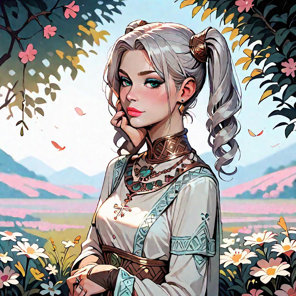 Score_9, score_8_up, score_7_up, score_6_up, (celtic knot:1.2), ring, flower field, four-leaf clover, nereirfpnxl, frieren, silver hair, twintails, bridal gauntlets