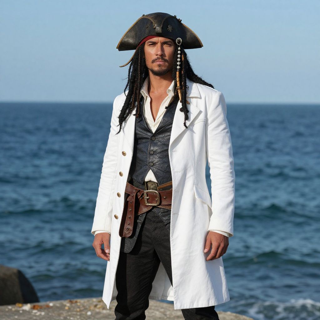 Photograph of a tall, handsome man with long black dreadlocks, wearing a black tricorn hat with a gold emblem, a white long coat over a black vest and shirt, black pants, and a brown leather belt with a large buckle. He stands confidently on a rocky shoreline with a vast, blue ocean and clear sky in the background. His serious expression and pirate attire evoke a classic pirate theme. The sunlight highlights the textures of his coat and hat, while the ocean waves gently crash in the background.