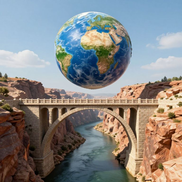 A surreal 3D-rendered scene depicts a grand stone bridge spanning a serene river canyon, with a colossal globe hovering above, symbolizing a fantastical connection between Earth's past and future, blending realistic textures with imaginative visual effects.