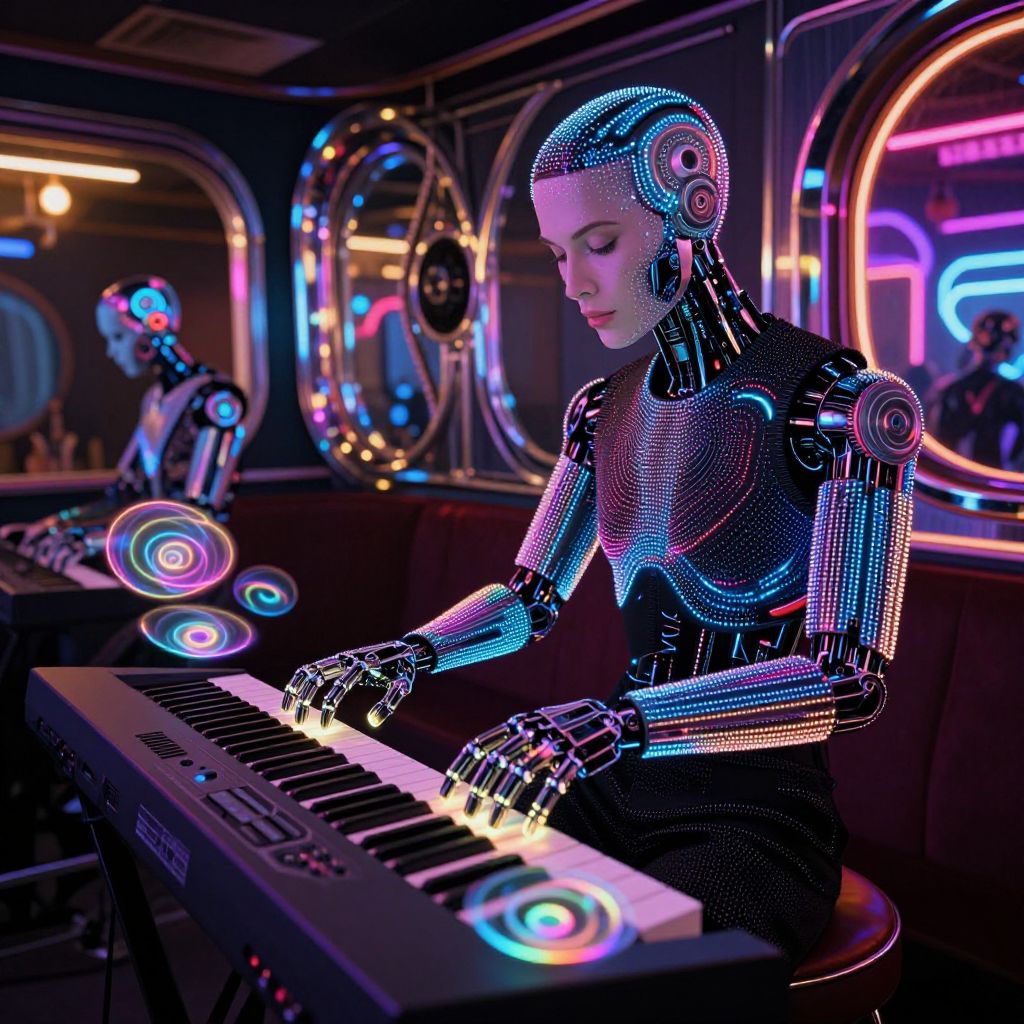 A captivating portrait of an android musician in a neon-infused, retro-futuristic jazz club, featuring intricate LED patterns reminiscent of Op Art's complexity. The subject, a harmonious blend of human and mechanical elements, plays an electronic keyboard with luminous keys that emit mesmerizing holographic spirals, evoking a sense of wonder and nostalgia. As the cybernetic artist performs, parallel reflections in the nearby chrome surfaces create a complex visual tapestry, drawing the viewer into a world where technology merges seamlessly with artistic expression, leaving them entranced by both the beauty and mystery of this enthralling scene.