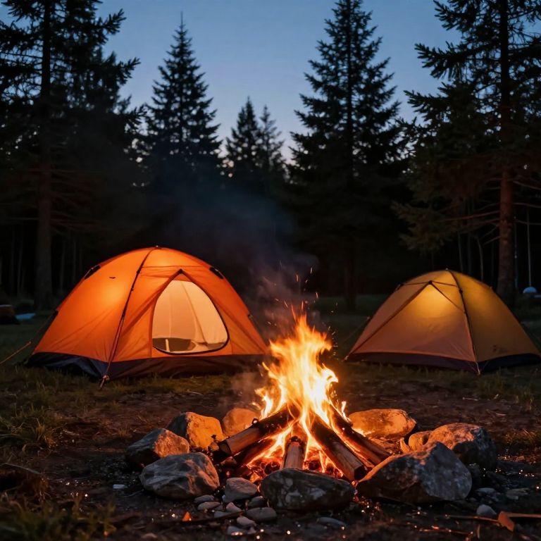 Warm campfire crackles brightly in the center of a rocky circle, casting golden light on a vibrant orange tent illuminated from within, while tall evergreen trees stand silently in the background under a twilight sky.