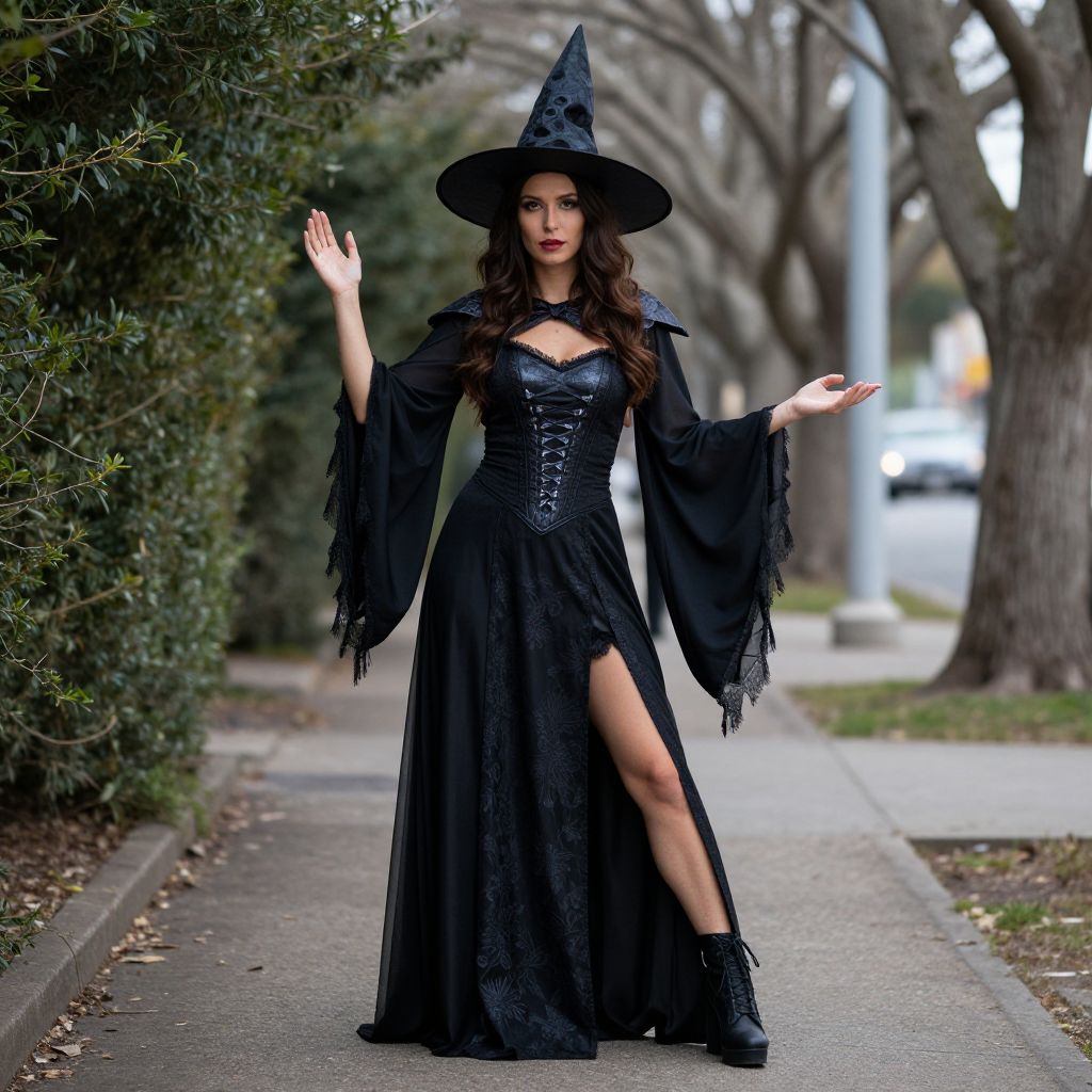 Photograph of a woman in a black witch costume with a pointed hat, lace dress, and thigh-high slit, standing on a suburban sidewalk with trees