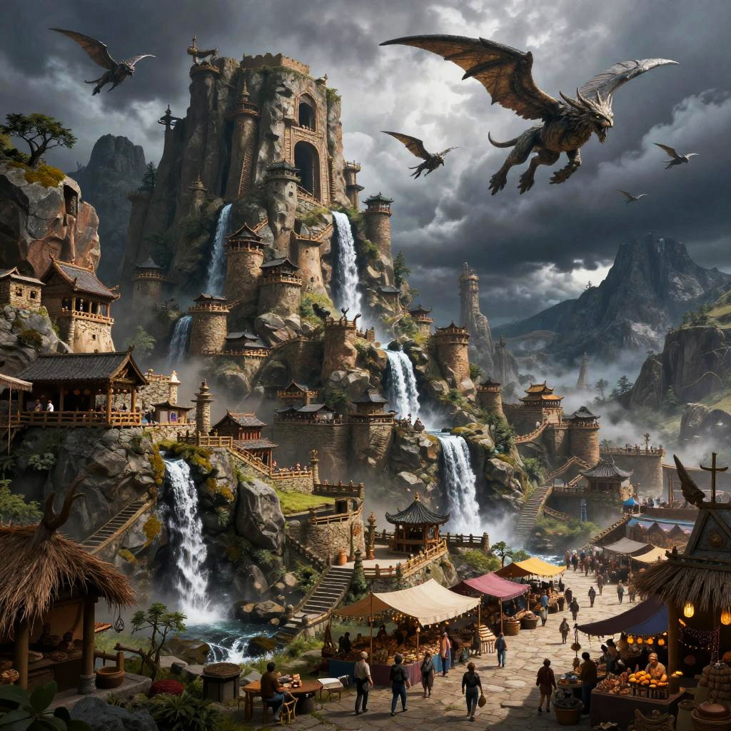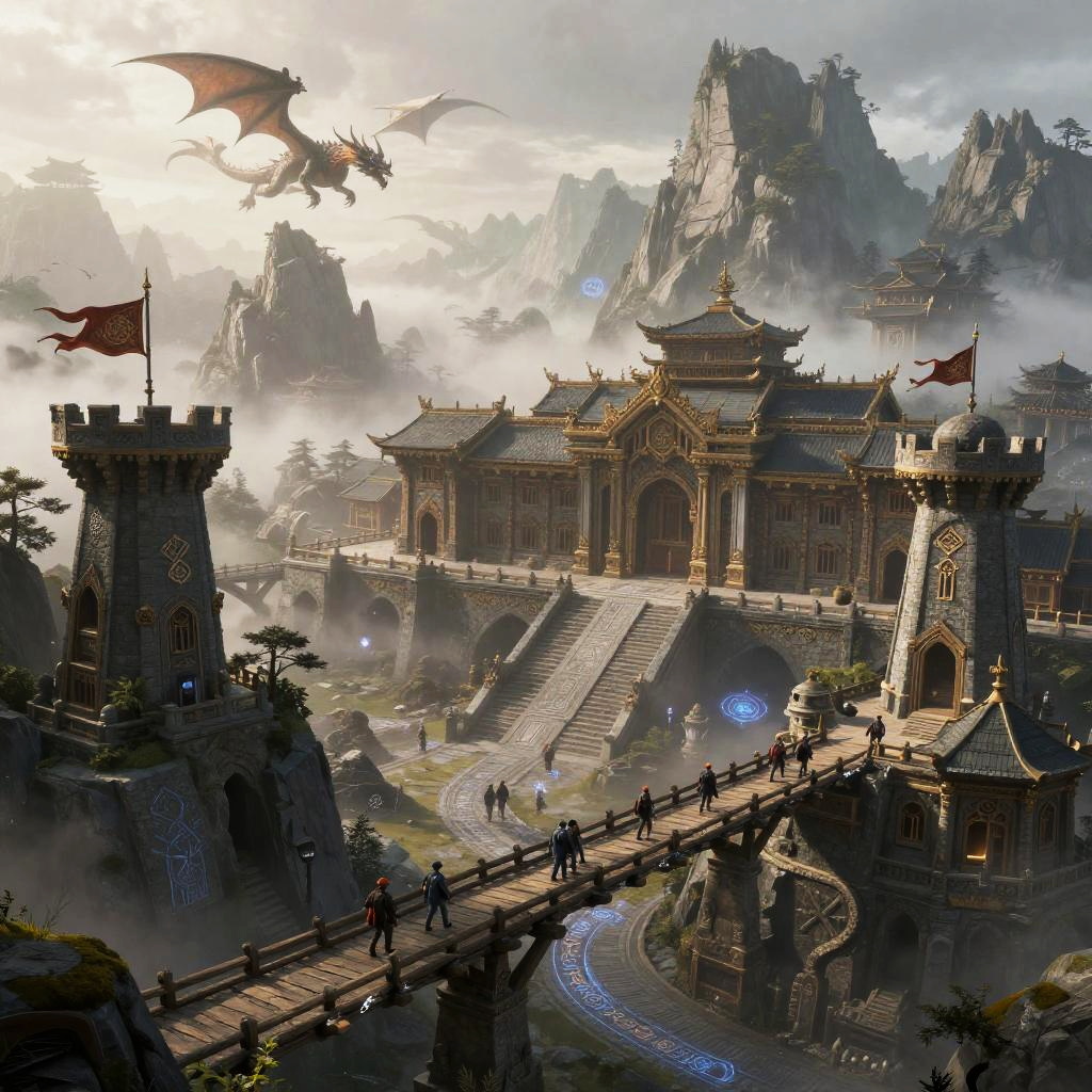 Fantasy digital artwork of a majestic castle with dragon flying overhead, surrounded by misty mountains, bustling bridge, and flag-topped towers.