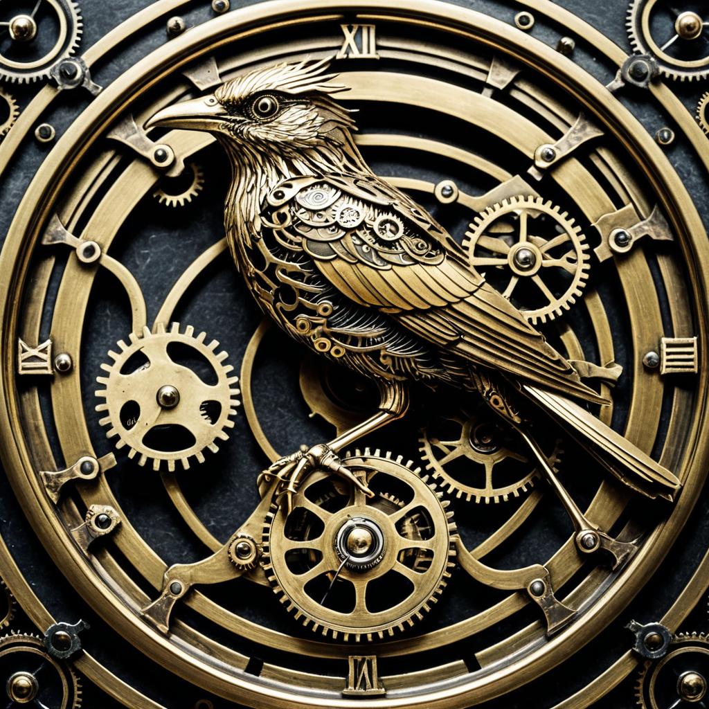 Ultra-detailed close-up of a steampunk-inspired clock featuring a brass mechanical bird surrounded by intricate polished brass gears and Roman numeral clock markings. The design combines realism with artistic elements influenced by H.R. Giger and Alphonse Mucha, showcasing precise craftsmanship in steampunk style.