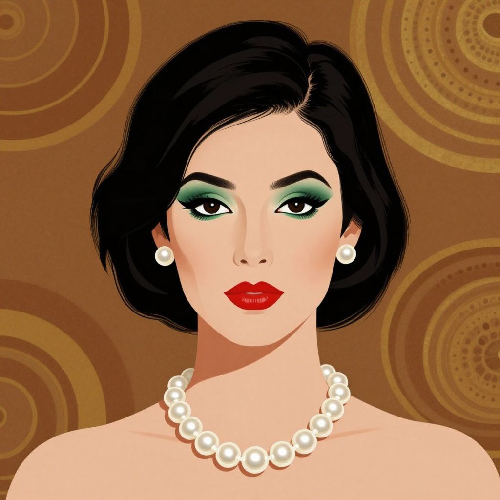 The image depicts a woman with a striking and stylized appearance, reminiscent of Milton Glaser's iconic illustrations. Her dark, bobbed hair frames her face, which is adorned with vibrant green eyeshadow and bold red lipstick. She wears a pair of small, round earrings that complement her elegant pearl necklace, which rests gracefully around her neck. The necklace is composed of large, evenly spaced pearls that add a touch of sophistication to her look. The background features a warm, earthy tone with abstract, circular patterns in shades of brown and gold, creating a harmonious contrast with the woman's vivid makeup and jewelry. The overall composition is balanced, with the woman's face and jewelry being the focal points, while the background elements provide a subtle, yet effective backdrop.