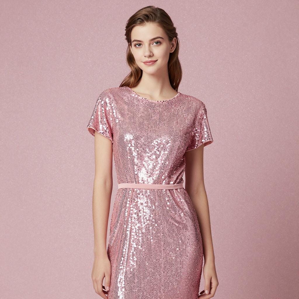 Glitter dress silver, photograph of a beautiful young woman, standing, facing camera, wearing a shiny silver latex long-sleeve dress with a high neck, light brown hair in a messy bun, neutral expression, silver sequin background, natural light, high detail, realistic, front view, fashion, elegant, modern, celebrity look-alike, professional portrait, studio shot, no accessories, symmetrical composition