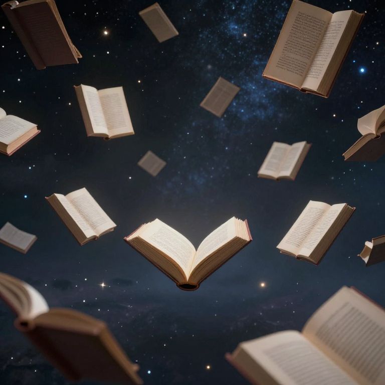 Photograph-like digital artwork depicting an ethereal scene of open books floating in a starry, cosmic night sky. The books, of varying sizes, are illuminated with a soft, glowing light, creating a magical effect. The background is a deep, navy blue with a starry texture, resembling the Milky Way. The books are arranged randomly, with one prominently centered and glowing brighter than the others. The pages of the books are slightly translucent, showing faint text. The overall composition evokes a sense of wonder and magic, blending the realms of literature and the cosmos.