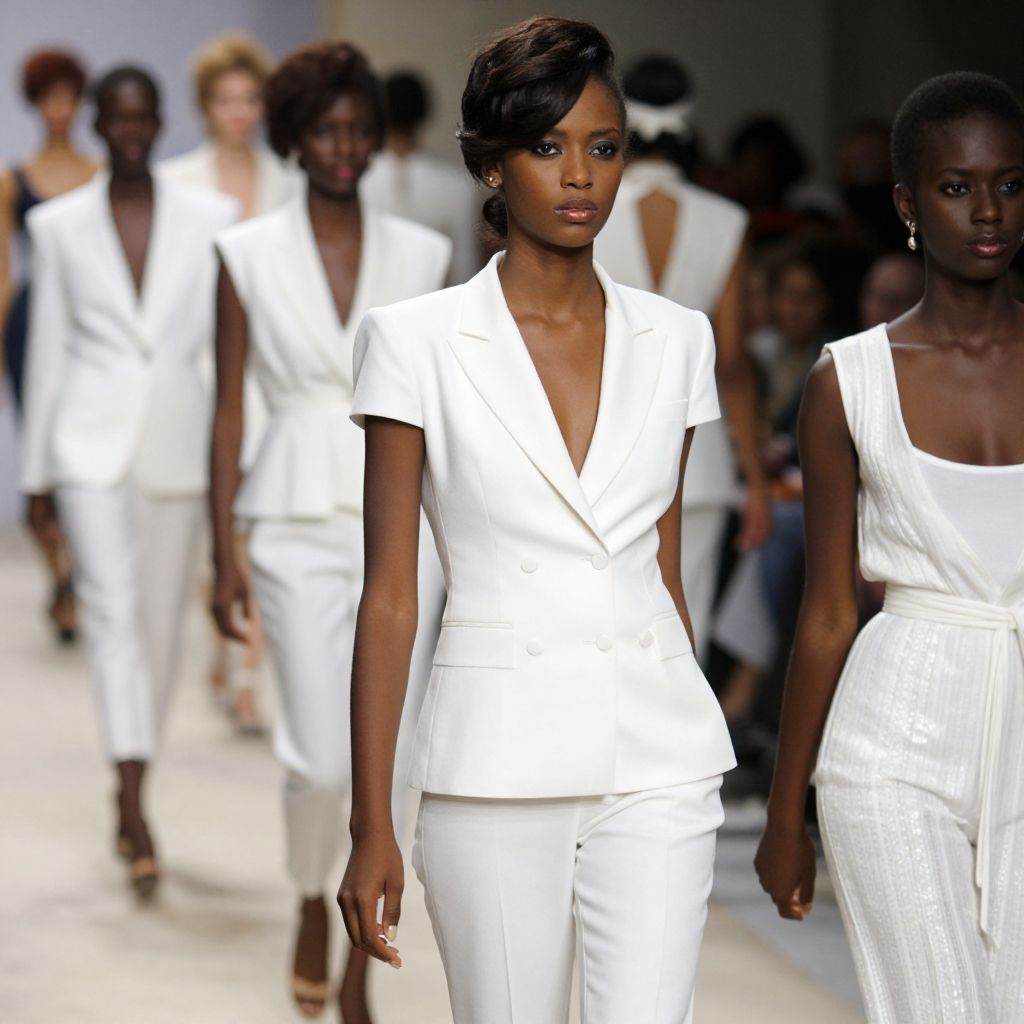 Photograph of a diverse group of African-American women modeling white, tailored, V-neck blazers and pants on a brightly lit runway.
