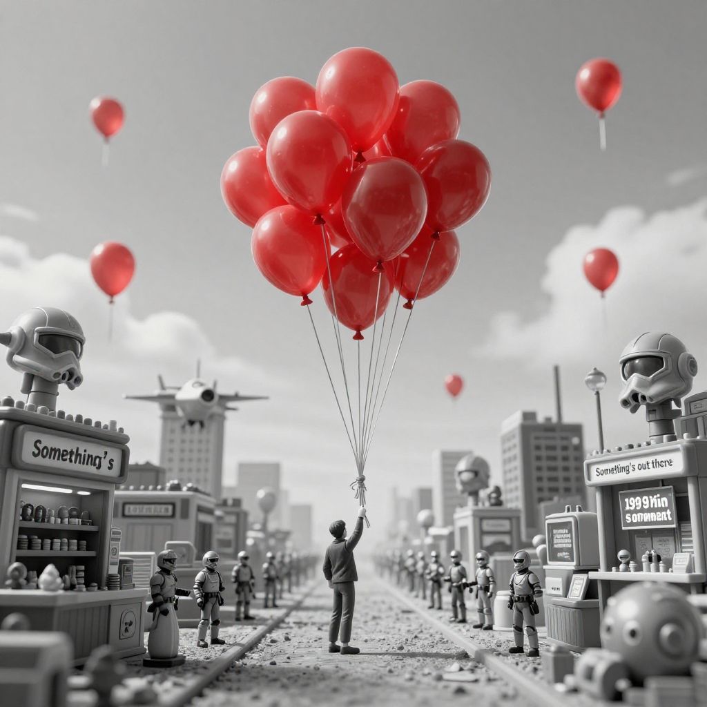 Photorealistic image of a man standing on train tracks in a grayscale miniature toy city, holding a large bunch of bright red balloons. The cityscape includes toy soldier figures, toy shops with signs reading 'Something's' and 'Something's out there,' and various buildings. Several red balloons float in the cloudy sky above, contrasting with the monochrome environment, conveying a surreal, nostalgic atmosphere.